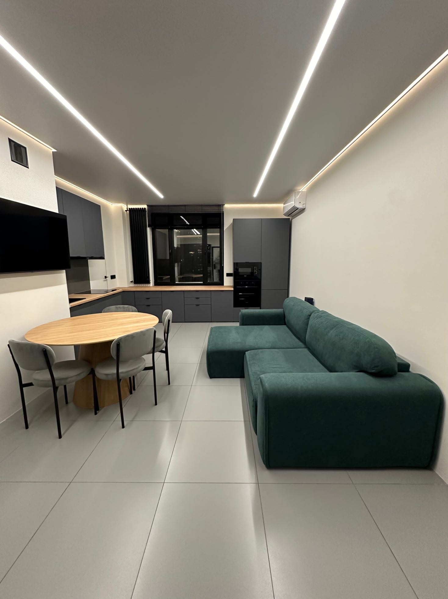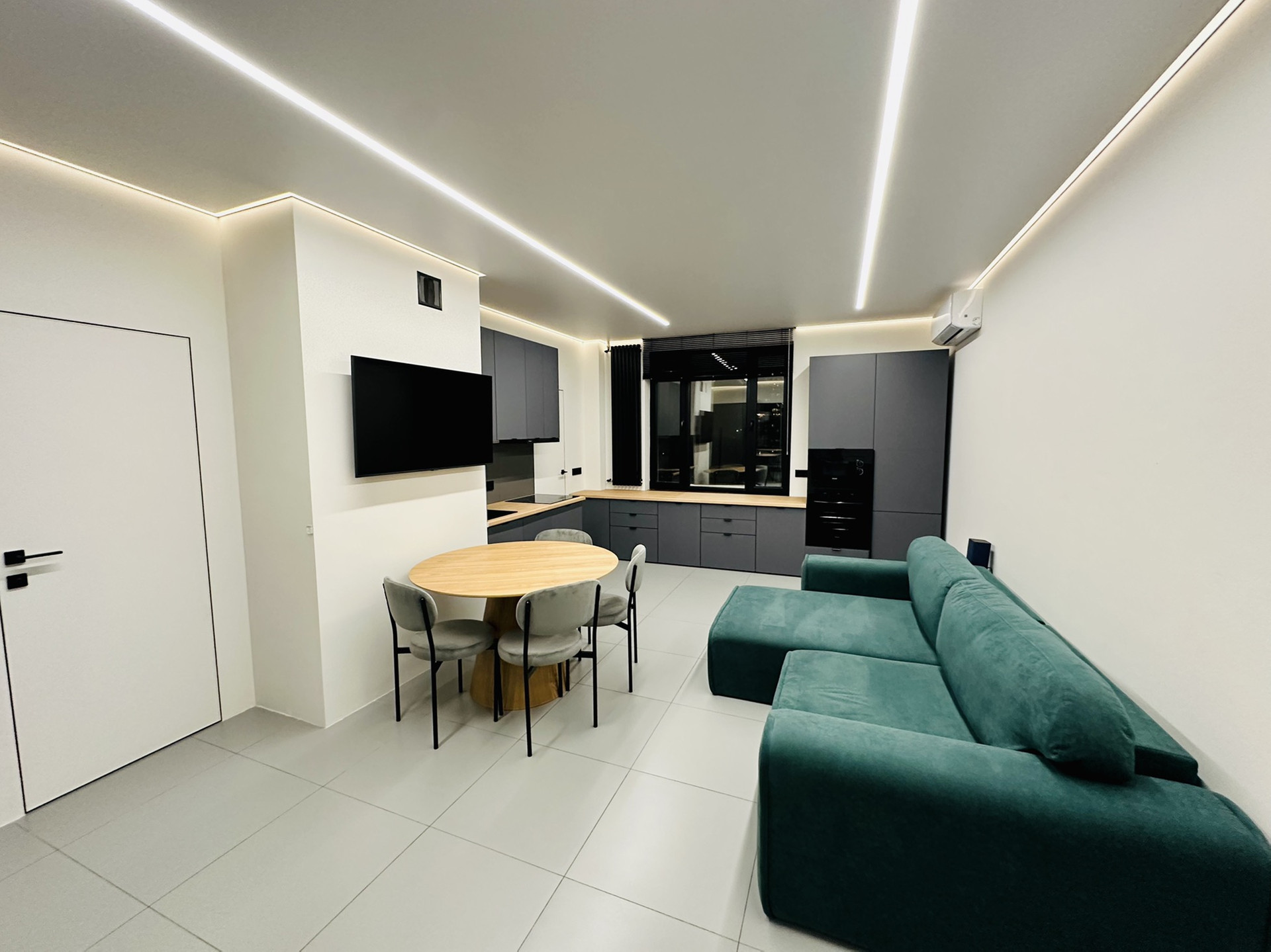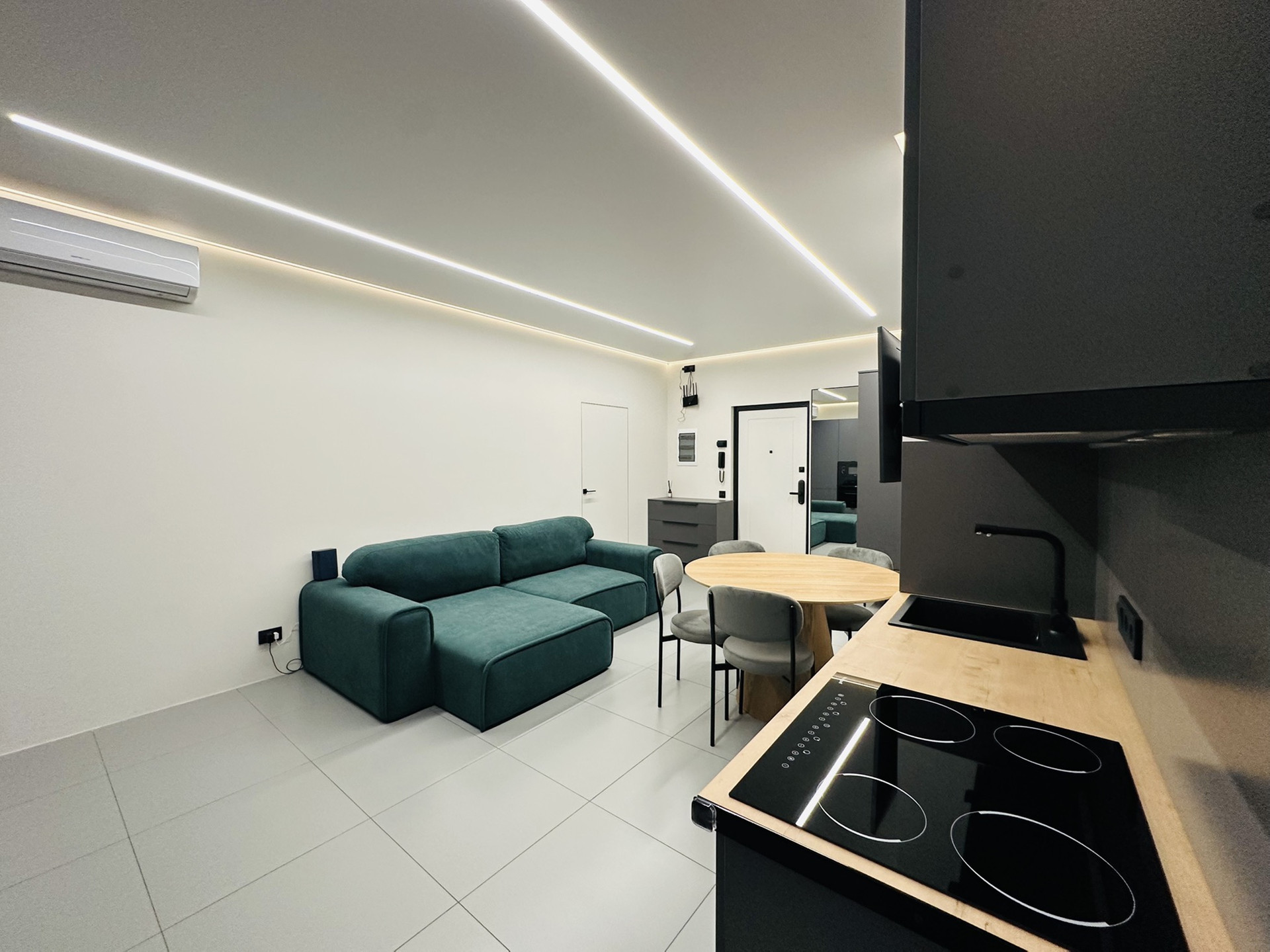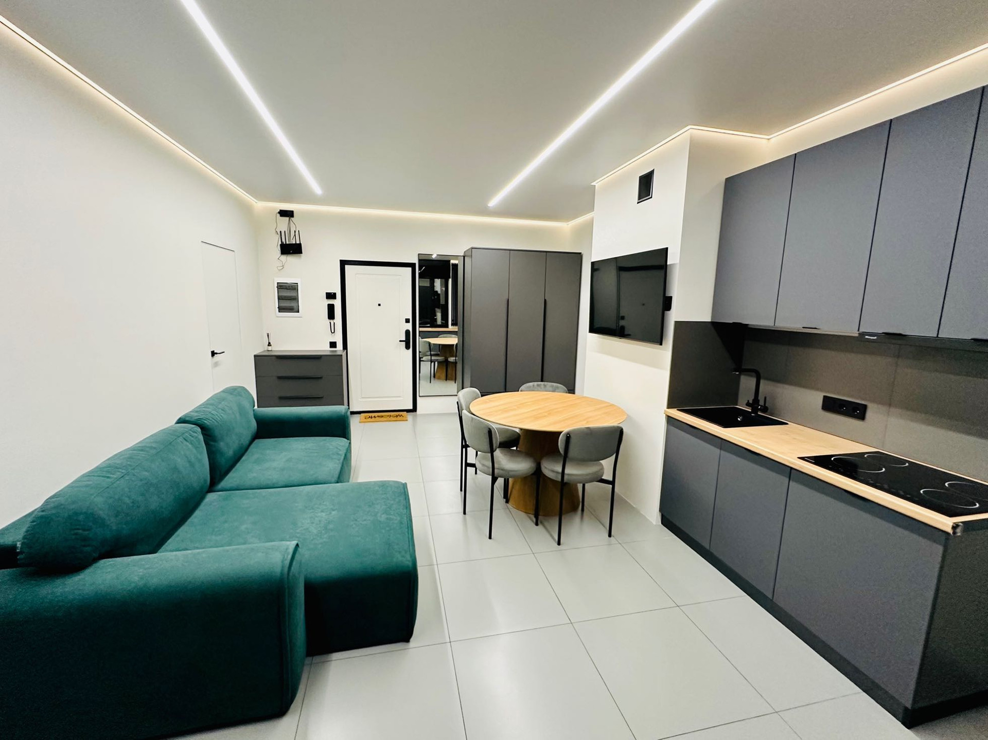 Только что закончен стильный, дорогой ремонт. Установлена система кондиционирования воздуха, установлены инверторные кондиционеры в спальне и гостиной. Натяжные потолки с теневым профилем и двухконтурной подсветкой. Система умный дом. Тёплые полы во всей квартире. Есть WI FI и цифровое телевидение. Квартира оборудована встроенной кухней, всей бытовой техникой(холодильник, стиральная машина, сушильная машина, варочная поверхность, духовой шкаф, вытяжка, телевизор, кондиционер и всей мебелью.