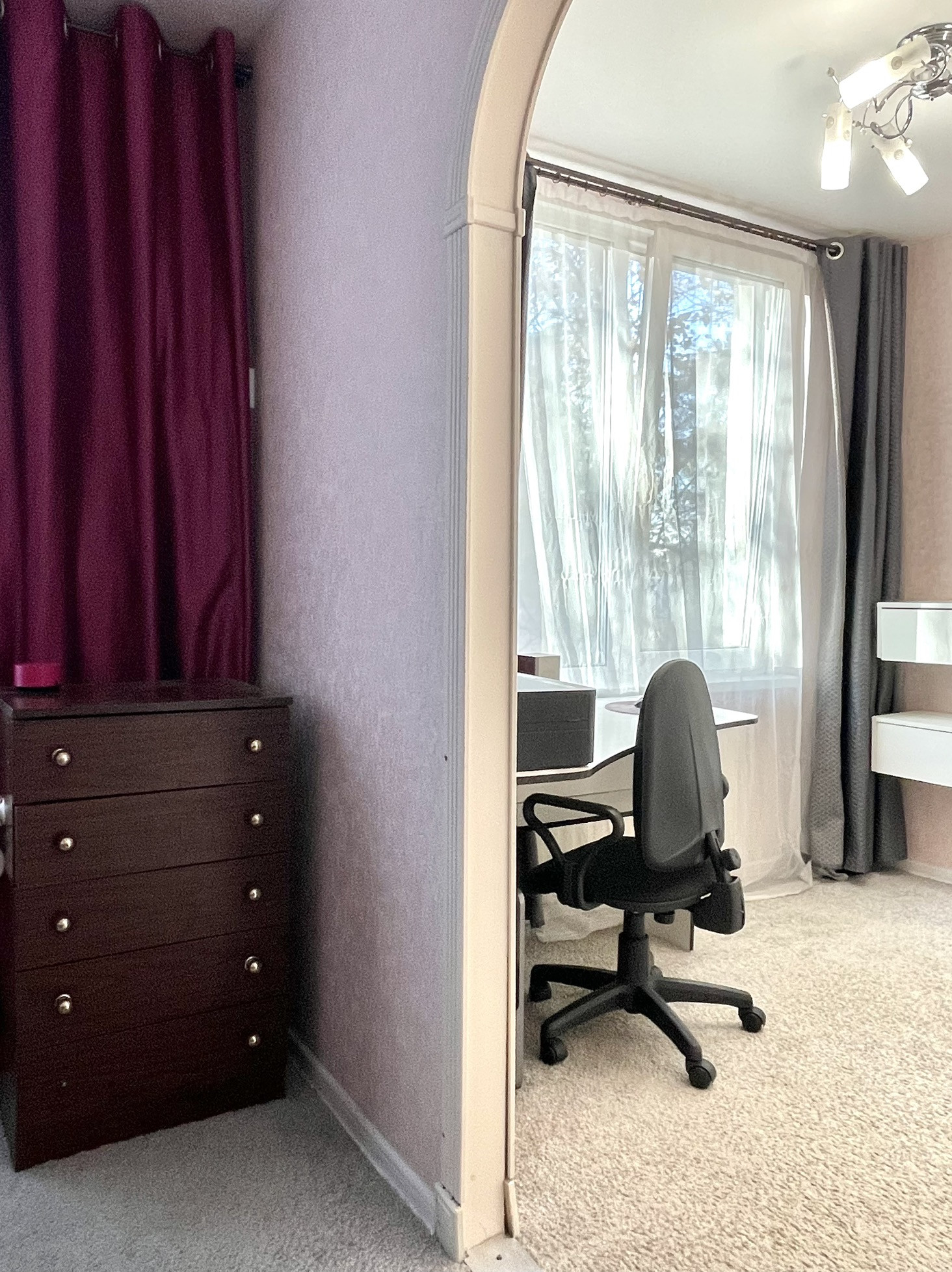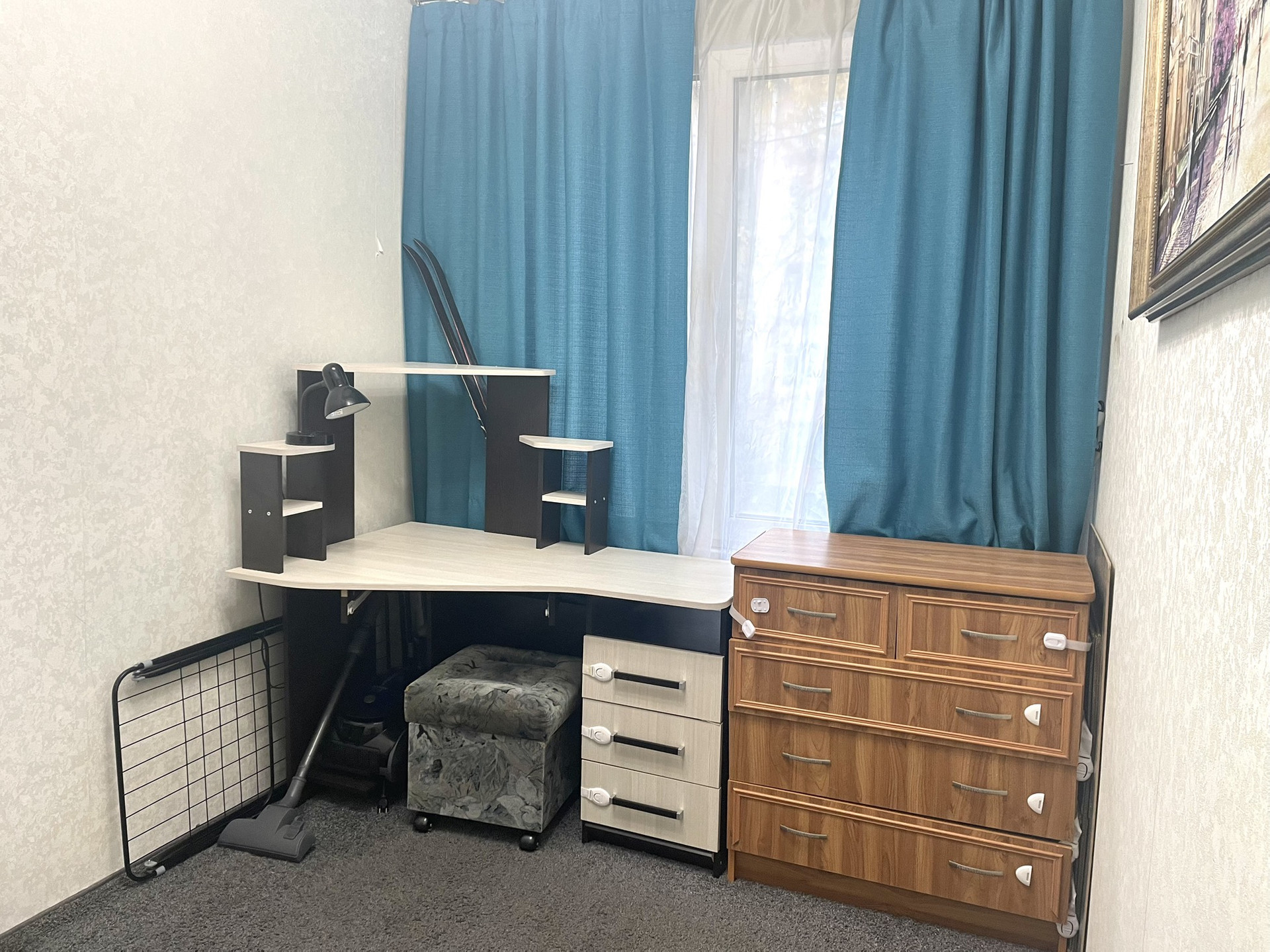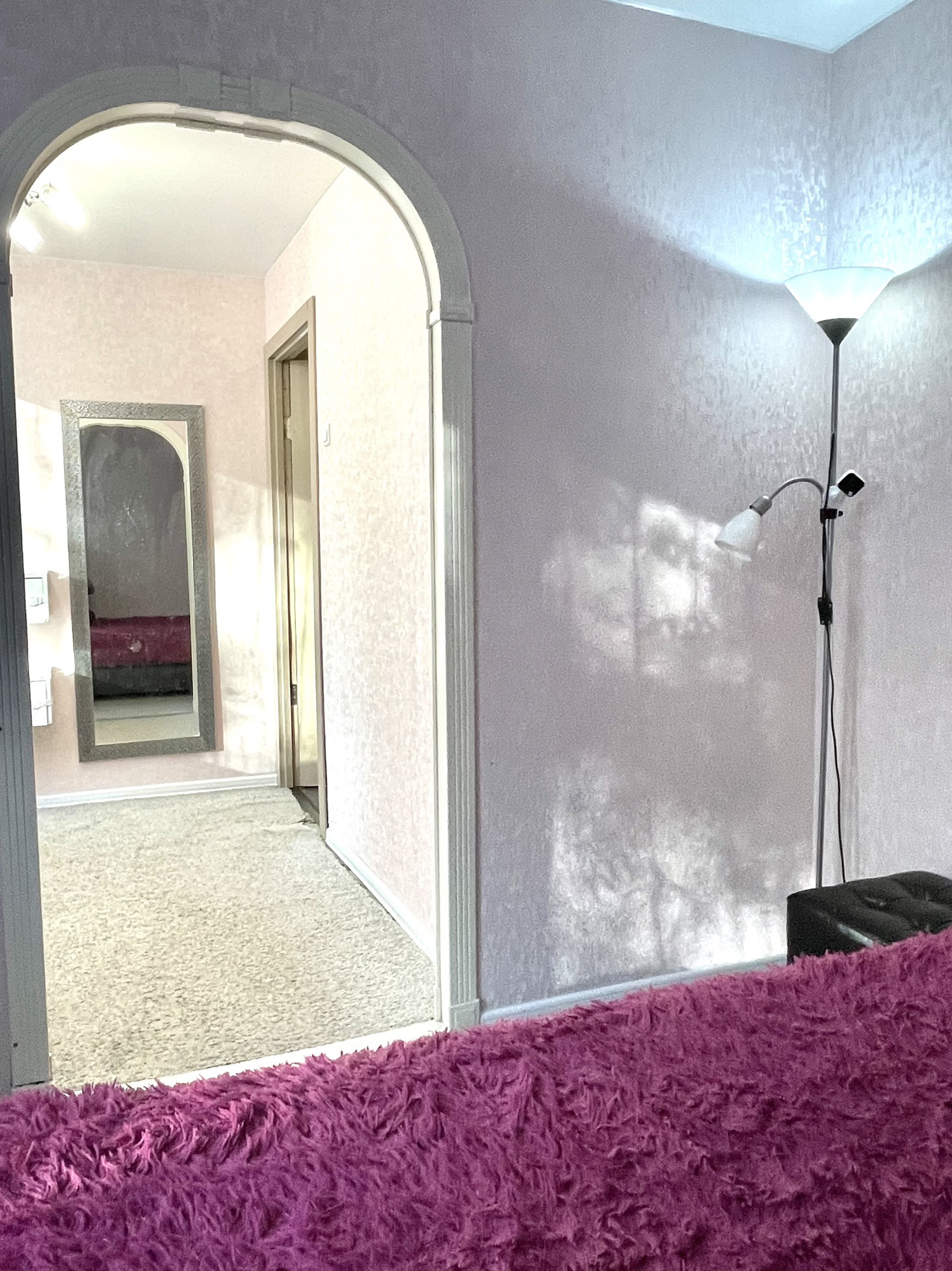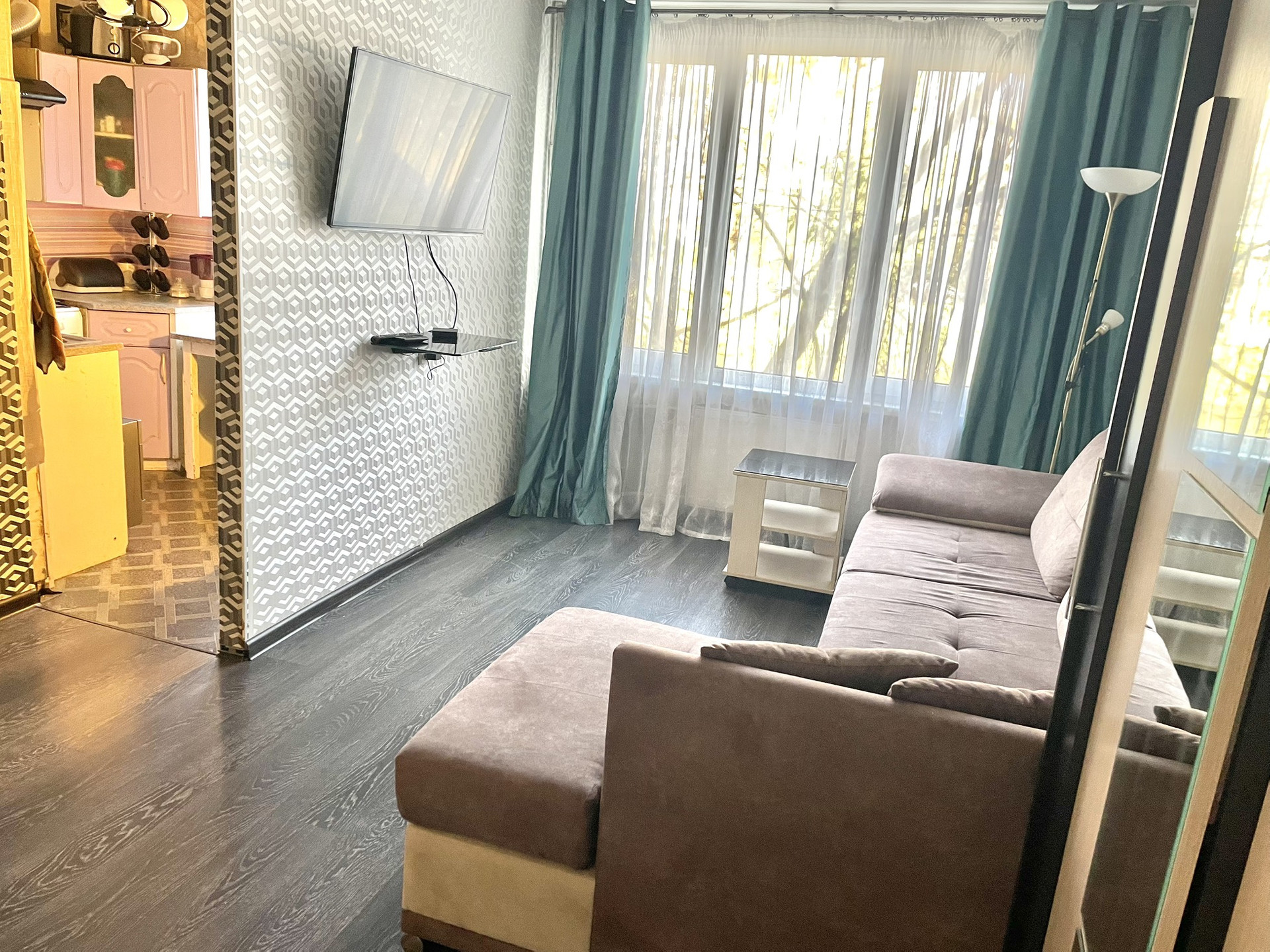 -Пуф, журнальный столик, компьютерное кресло, зеркала, подвесные полочки, два торшера - все, что видите на фото и в том виде, как на фото.
