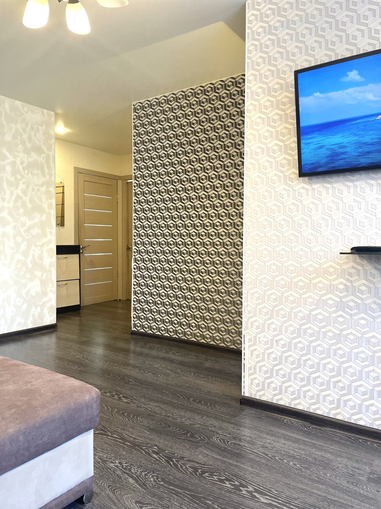 В спальне диодная люстра с множеством цветов и режимов свечения.