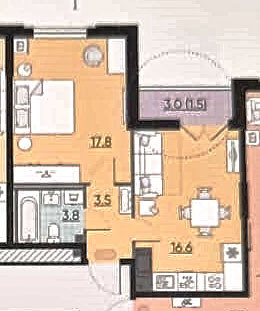 Комната 17,8м2  кухня 16,6м2  с/у совмещенный 3,8м2  коридор 3,5м2
