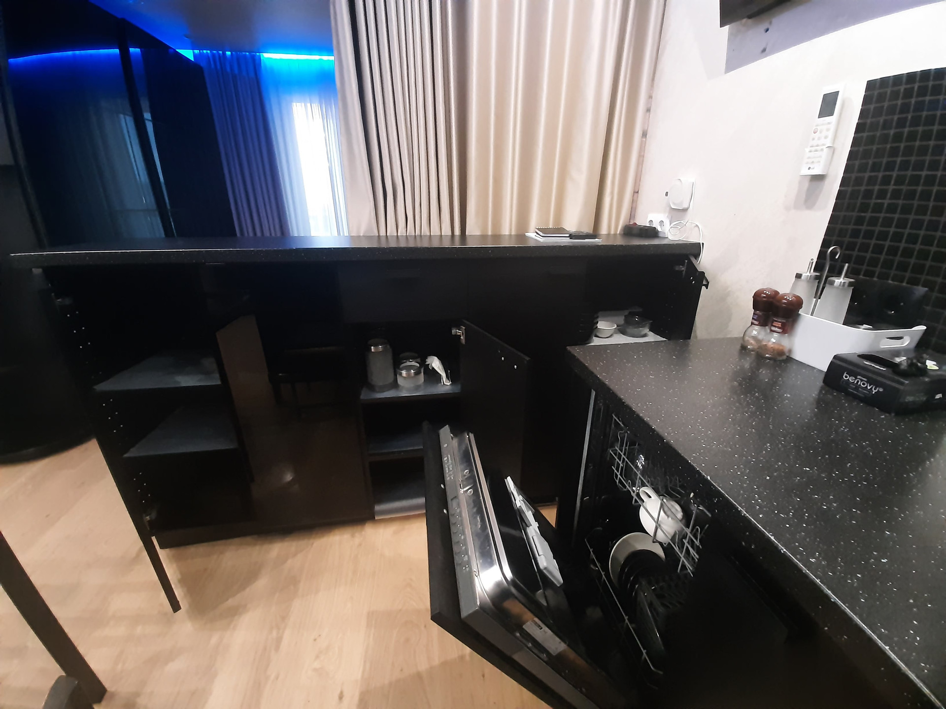 Стильная современная мебель и двухкамерный холодильник включаются в стоимость квартиры. Встроенная кухня с бытовой техникой, включая посудомоечную машинку и кухонную зону с телевизором; кондиционер LG, очиститель воздуха TION; вместительный гардеробный шкаф. Утепленный пол в лоджии, дополнительное спальное место. В целях безопасности, на этаже вход к квартирам через кодовую дверь.
