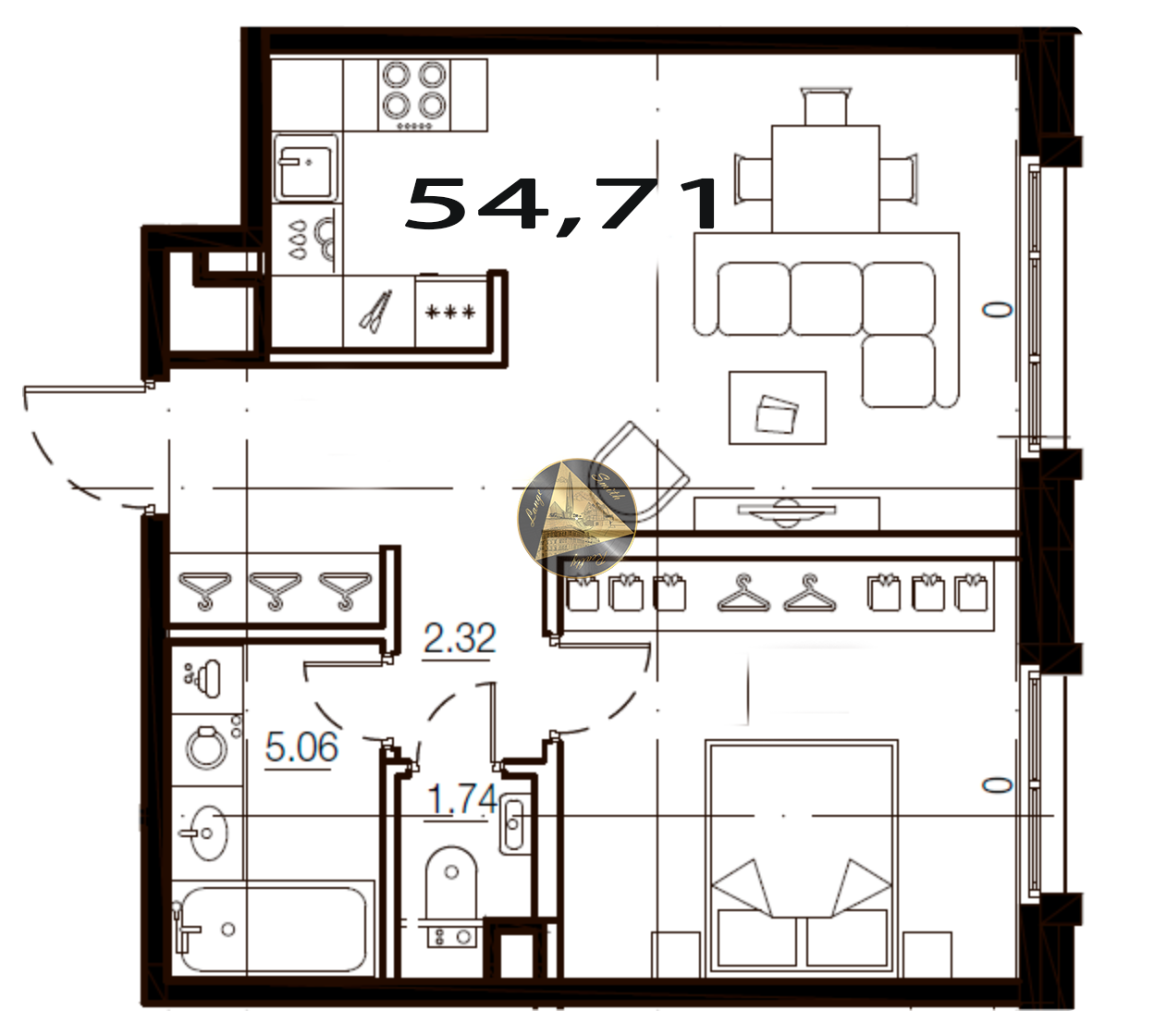Квартира находится на 9 / 9 этаже. Общая площадь квартиры 54,71 м2. Кухня 23.92 м2. Спальня 15.39 м2.  Санузел 5.06 + 1.74 м2.