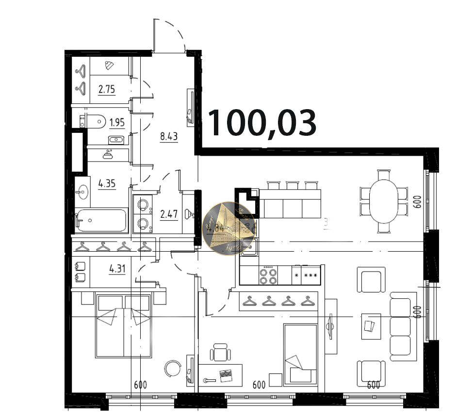 Квартира находится на 8 / 9 этаже. Общая площадь квартиры 100,03 м2. Кухня 37.2 м2. Спальня 14.2 м2. Гостиная 16.76 м2. Общее 30.96 м2. Санузел 4.35 + 1.95 м2.