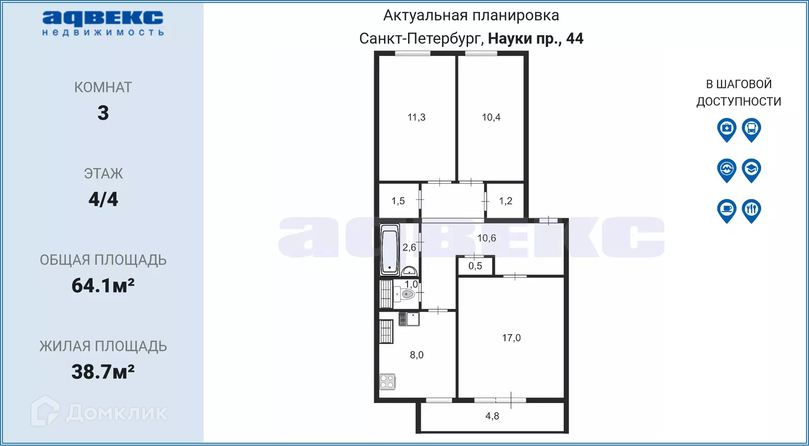 3-комнатная квартира, 64.1 м2, этаж 4 / 4, на продажу в Санкт-Петербурге, проспект Науки, 44