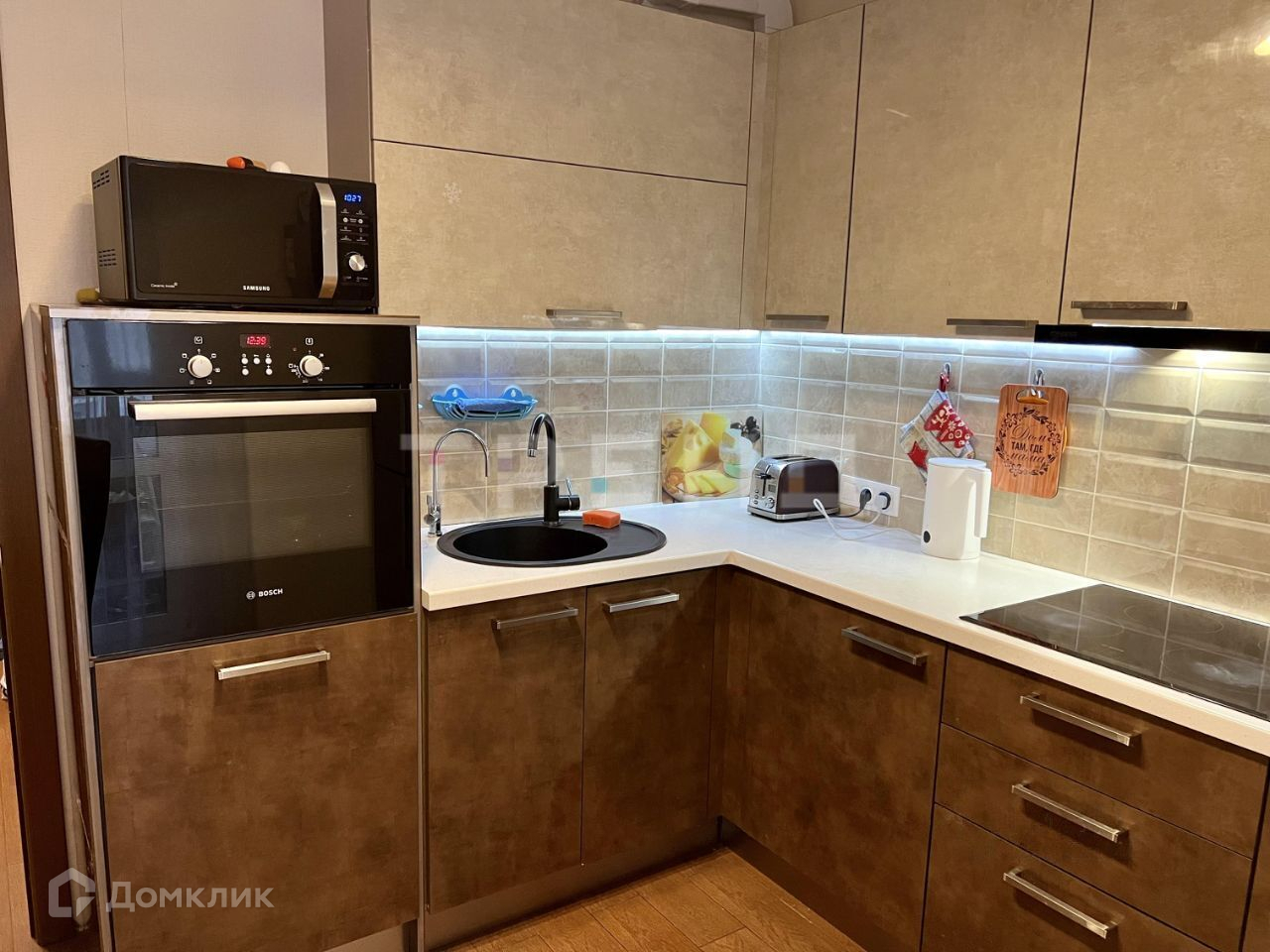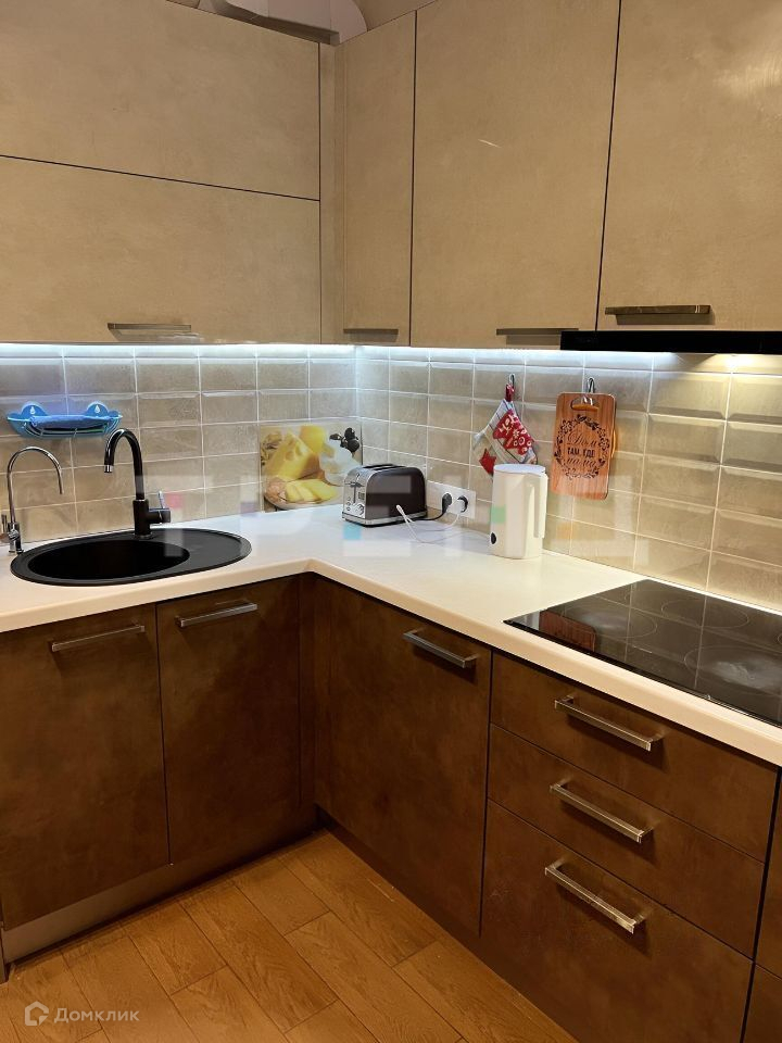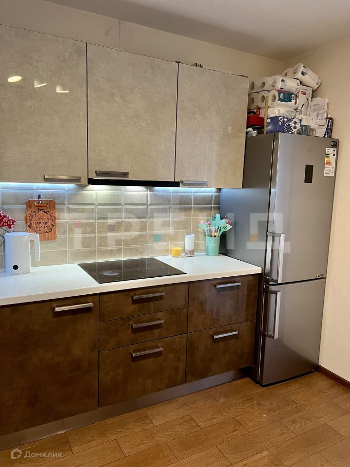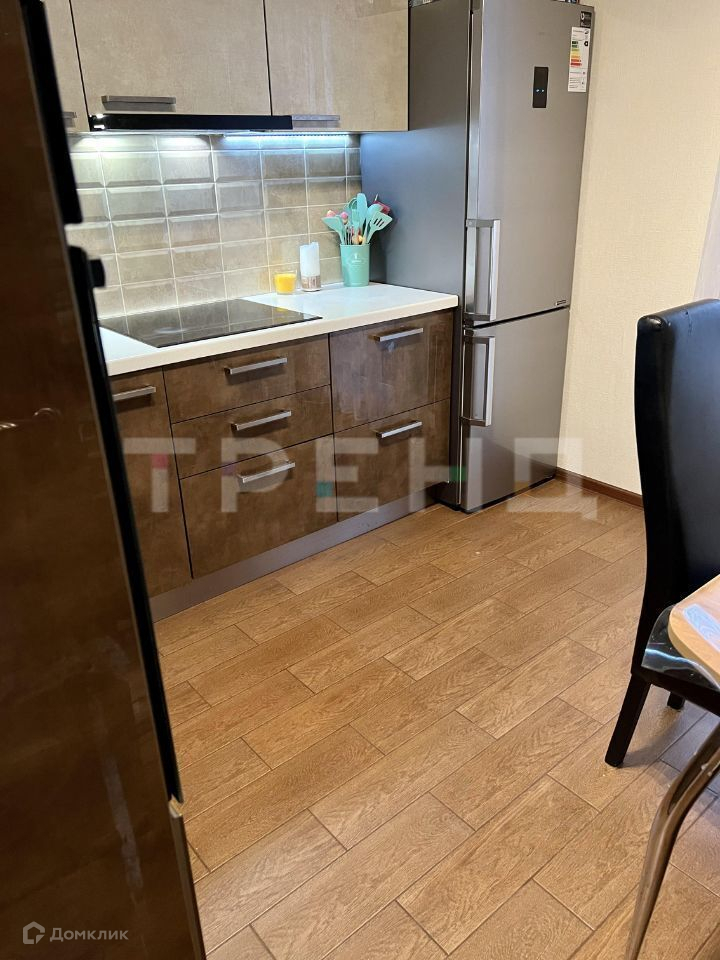В квартире выполнен свежий ремонт с использованием керамогранита на кухне, лоджии и в прихожей. Особое внимание было уделено кухне: большой кухонный гарнитур с каменной столешницей. Плита, духовой шкаф, посудомоечная машина фирмы Bosh, вытяжка - Kuppersberg.