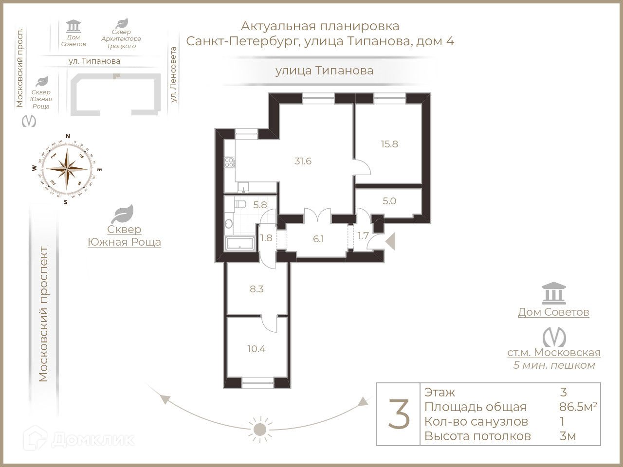 Престижный и развитый – это первые ассоциации с Московским районом Санкт-Петербурга. Но даже среди хорошего есть лучшее! Великолепная транспортная доступность по всем направления, развитая инфраструктура (детские сады и школы, торговые центры и аптеки, рестораны и деловые центры), один из самых лучших и больших парков города в шаговой доступности, просторная Московская площадь с фонтанами, благоустроенный двор с детскими площадками, безопасная парковка во дворе дома – все это важные и неотъемлемые составляющие проживания в доме номер 4 по улице Типанова. Консьерж в парадной, видеонаблюдение на каждом этаже
