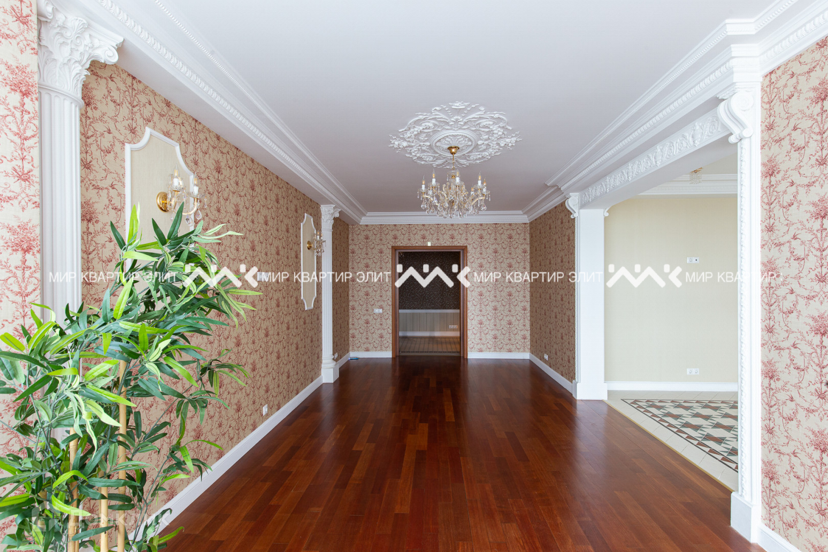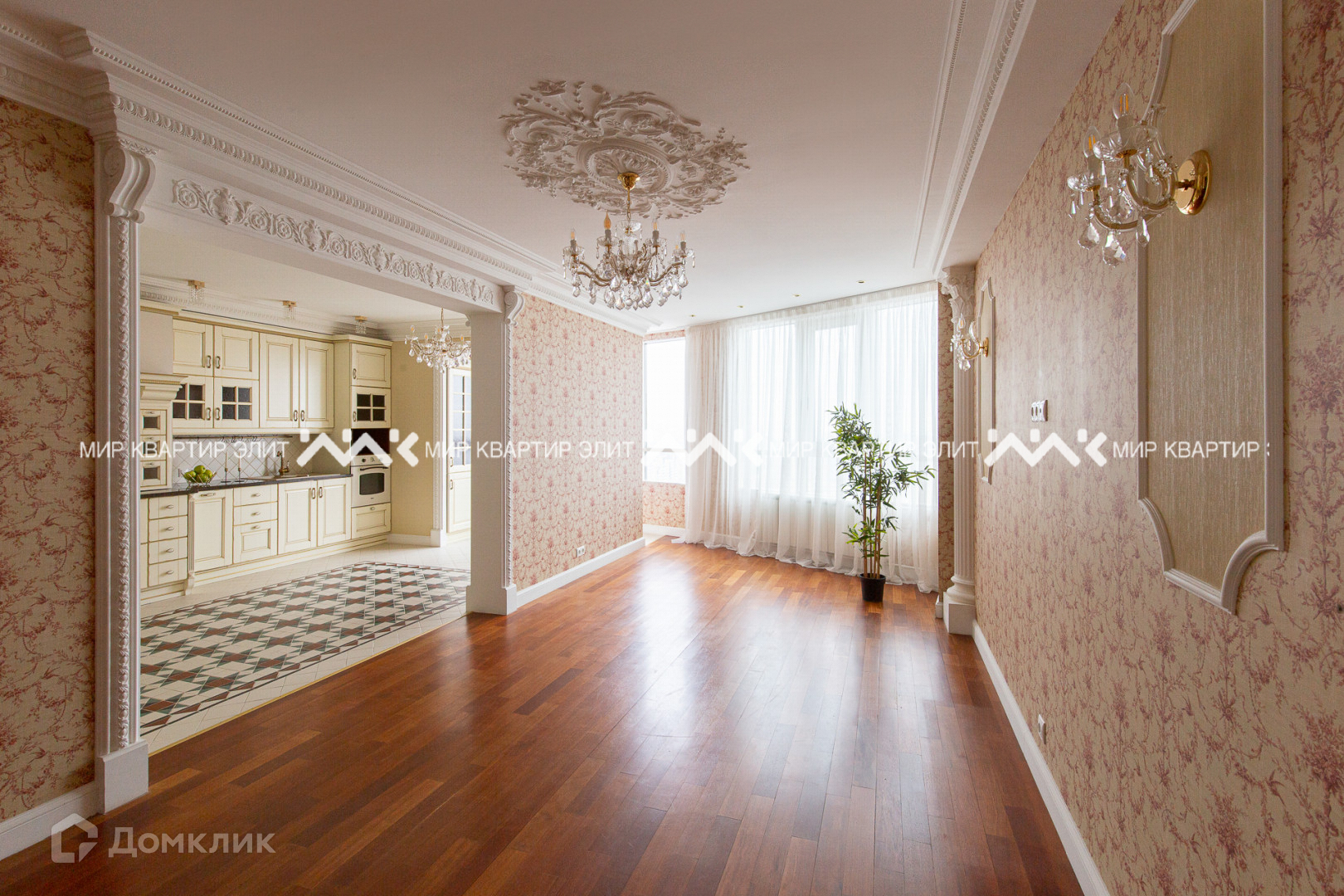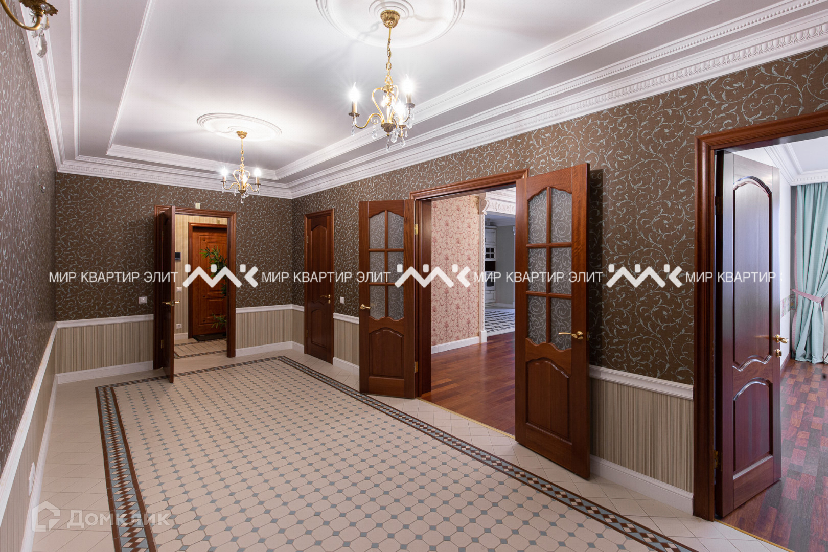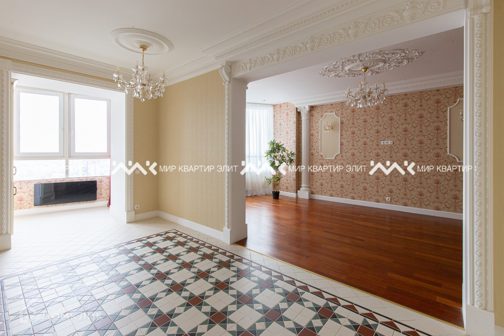 Метлахская плитка, паркетная доска, освещение из Италии, искусная лепнина, панорамные окна.