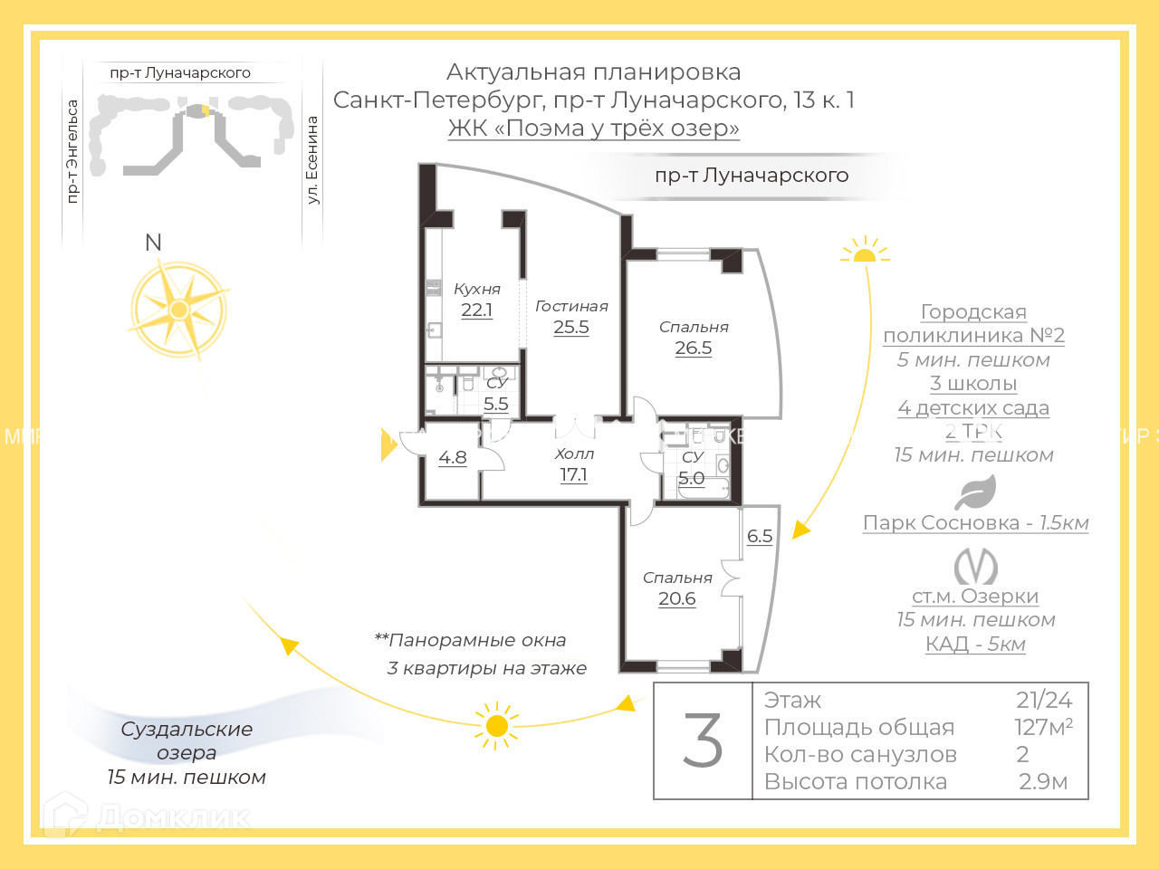 Банки, магазины, поликлиники, школы, лицеи, гимназии, живописные озера все в шаговой доступности.