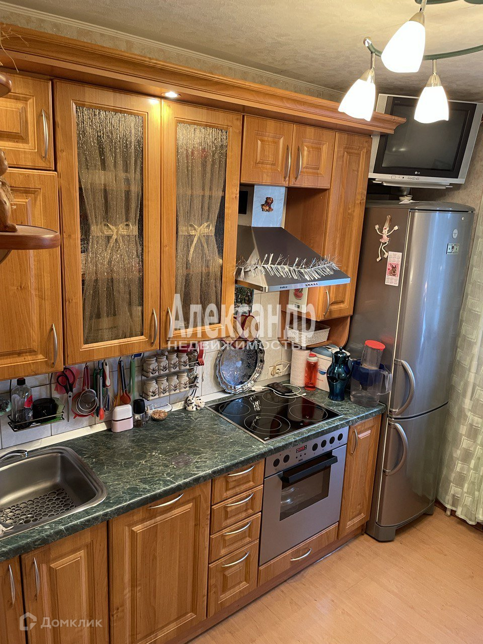 Квартира в отличном состоянии: в комнатах на полу паркет, стены, потолки выровнены, деревянные межкомнатные двери, на кухне и в коридоре на полу ламинат. Встроенный кухонный гарнитур. Санузел раздельный, в кафеле. В квартире оборудована вместительная гардеробная.