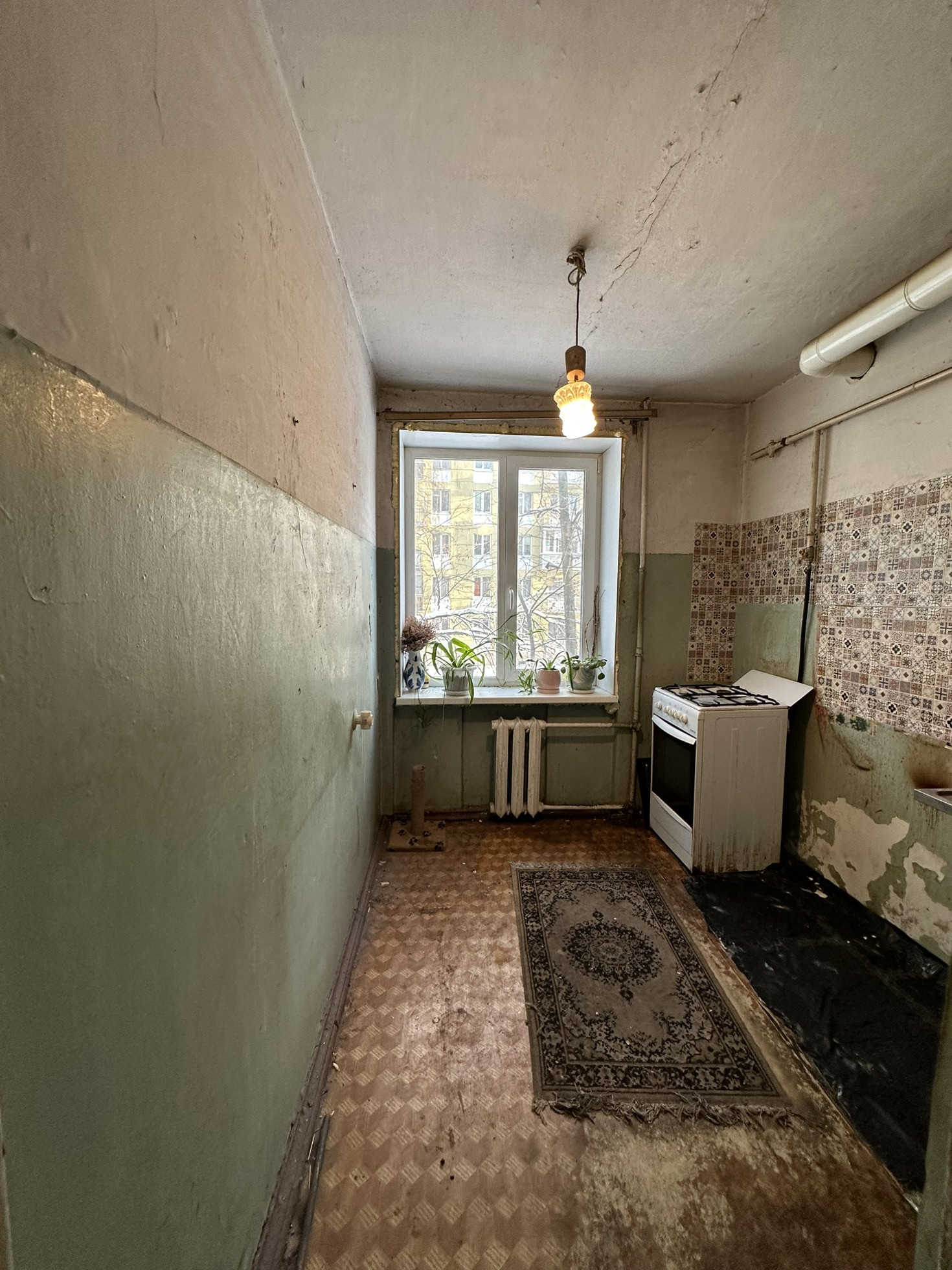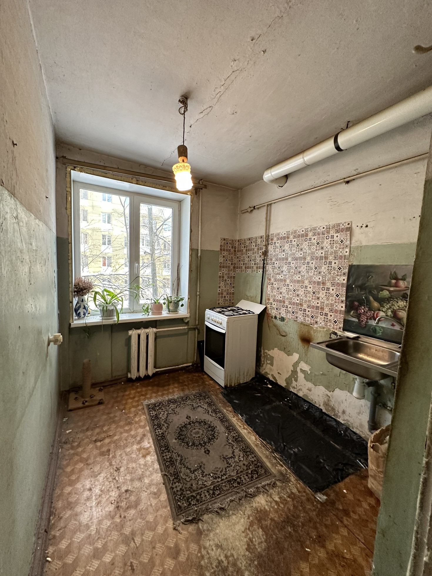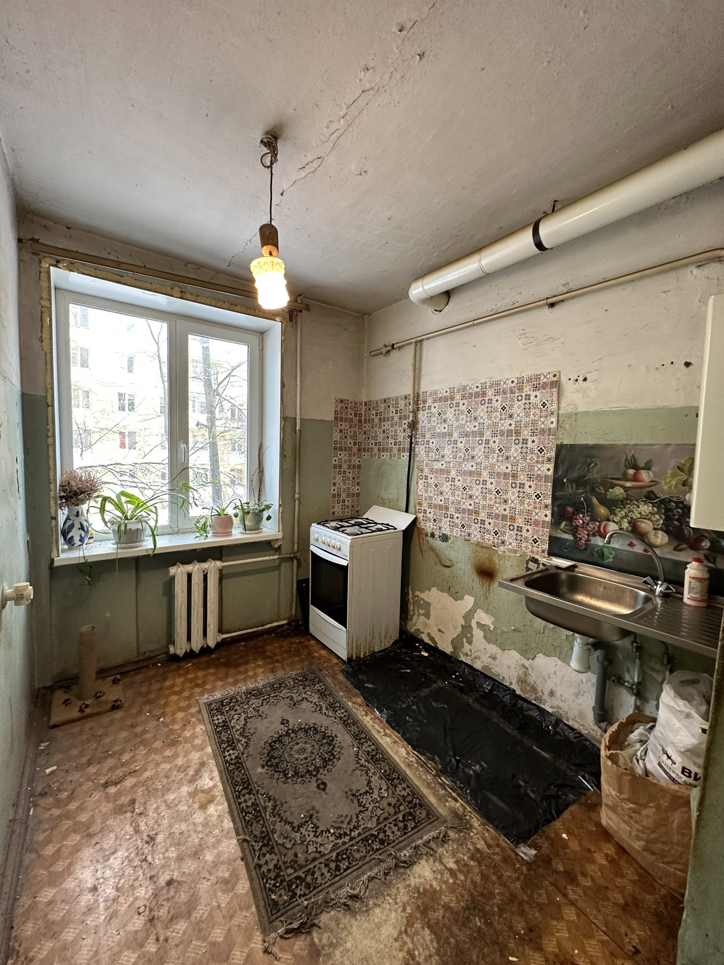 Квартира требует ремонта . Недавно установили новые окна  .Просторная и светлая комната , удобная кухня и санузел. Окна выходят в тихий двор . Квартира солнечная и уютная .
