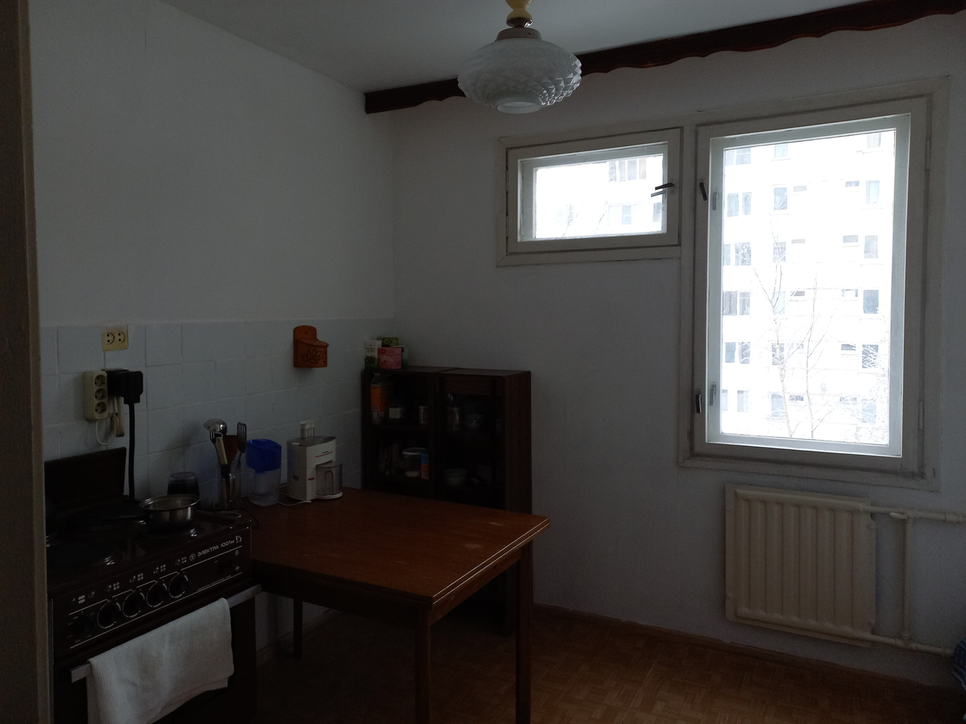 Напольное покрытие: в комнатах, кухня, прихожая - линолеум, в санузлах кафель. Есть электроплита с духовкой "Электра 1001М".