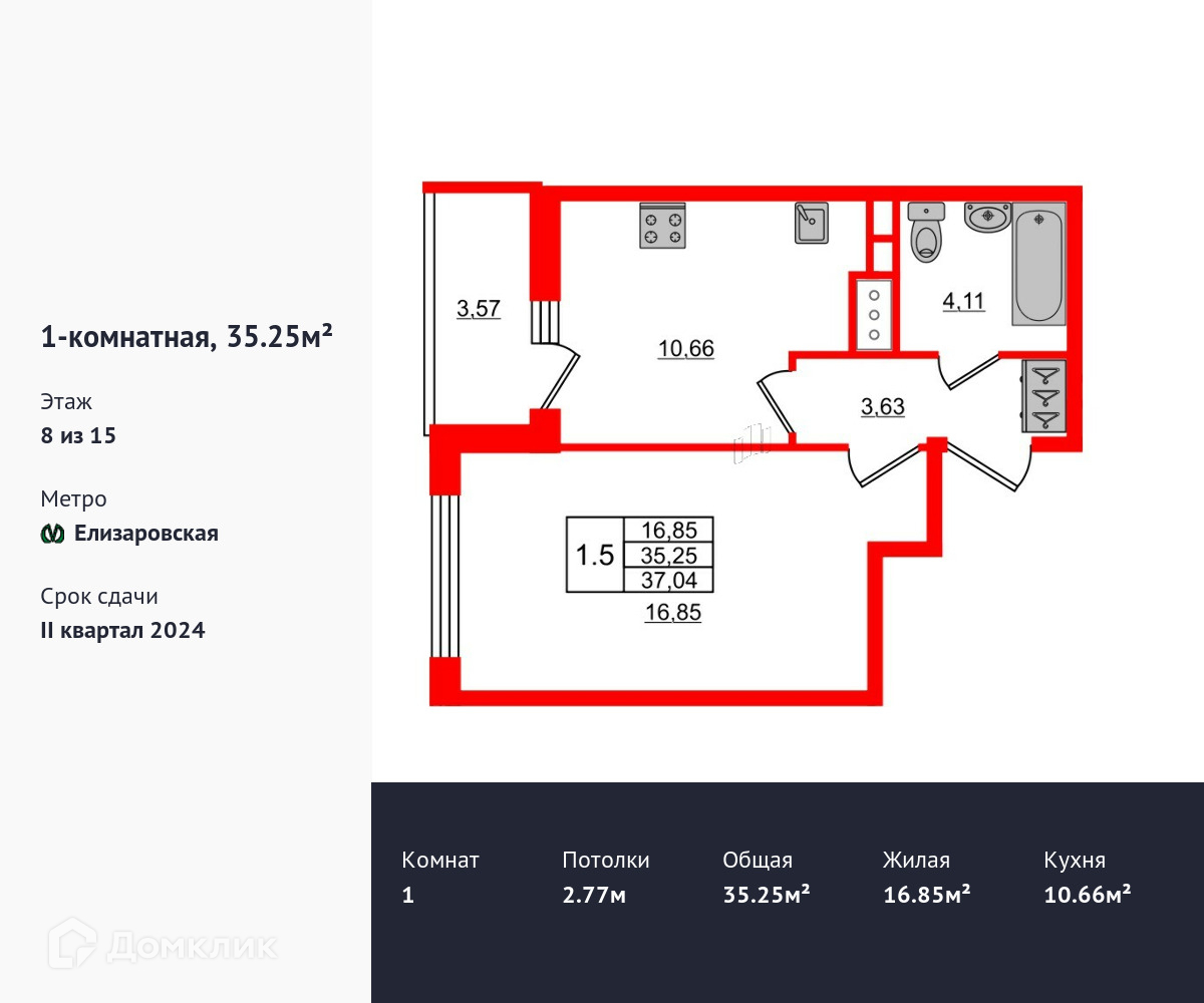Удобная, классическая планировка, кухня 10.66 м², вместительная прихожая 3.63 м². Общая площадь квартиры - 34.9 м², жилая – 16.85 м², высота потолка 2.77 м.