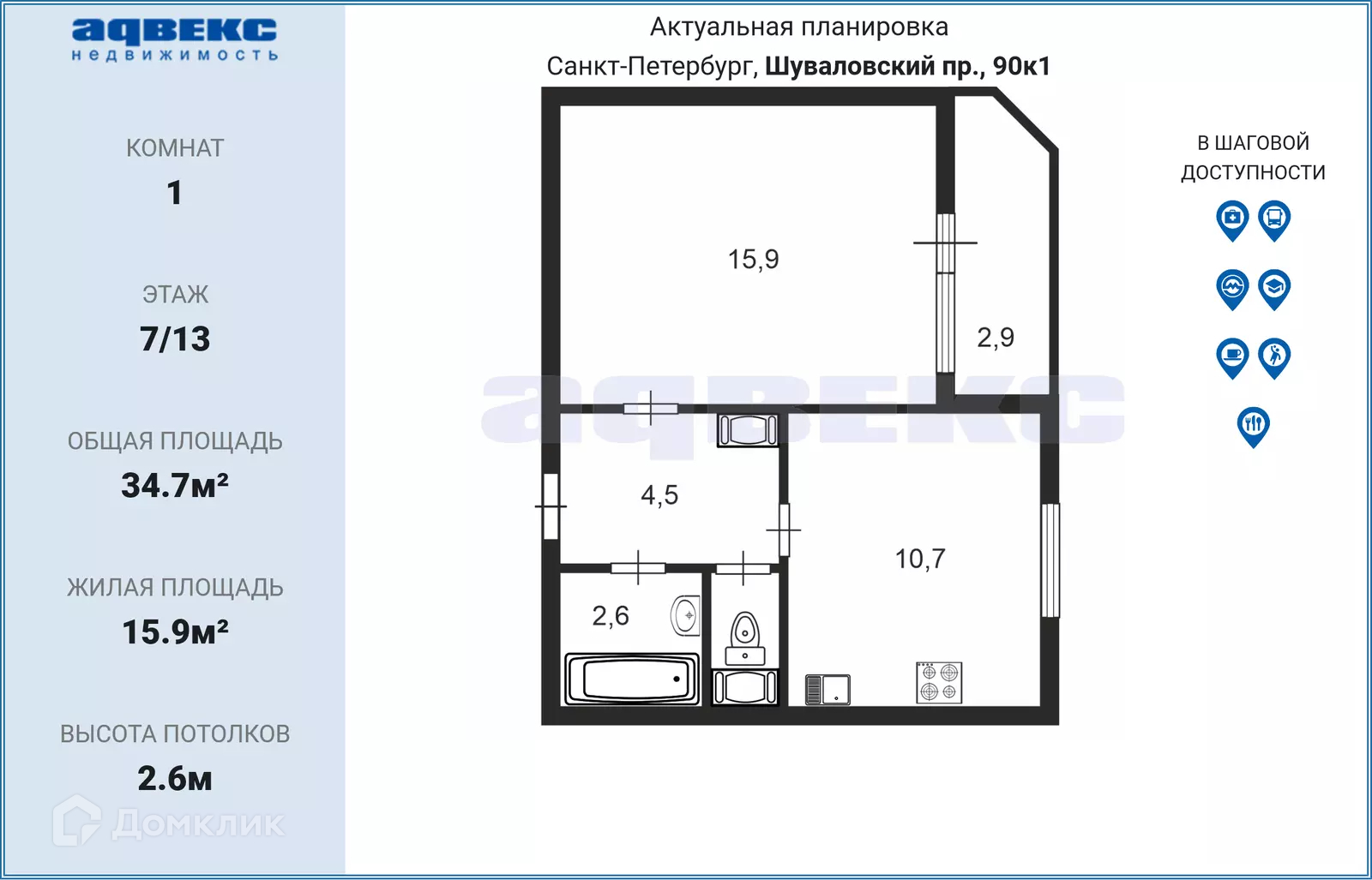 1-комнатная квартира, 34.7 м2, этаж 7 / 13, на продажу в Санкт-Петербурге, Шуваловский проспект, 90к1