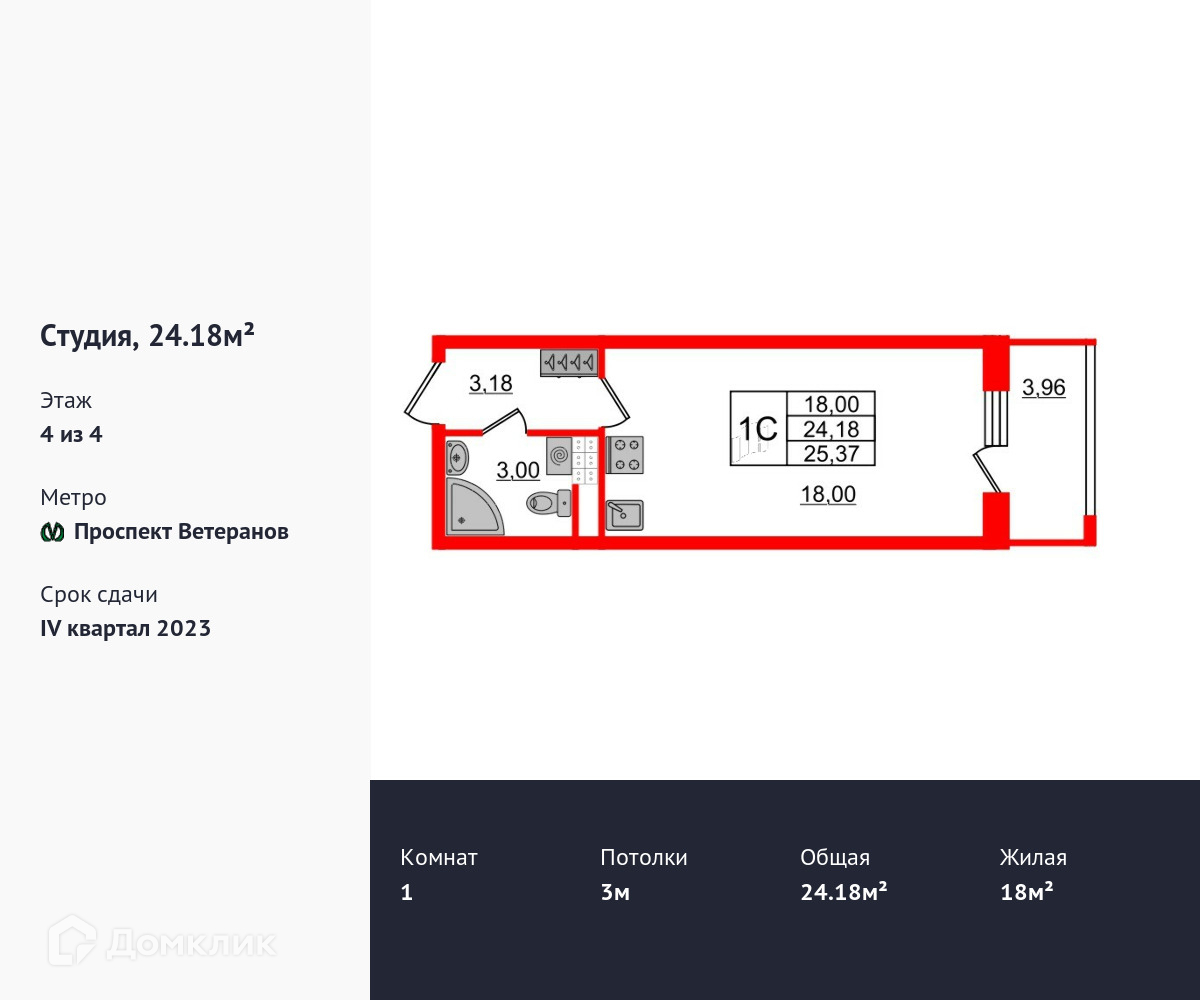 Квартира студия, 24 м2, этаж 4 / 4, на продажу в Санкт-Петербурге, проспект Ветеранов, 200