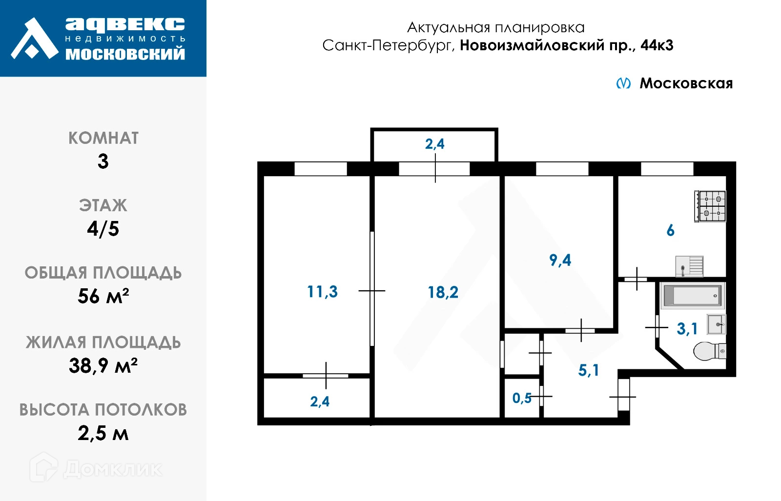 Общая площадь 56 м2