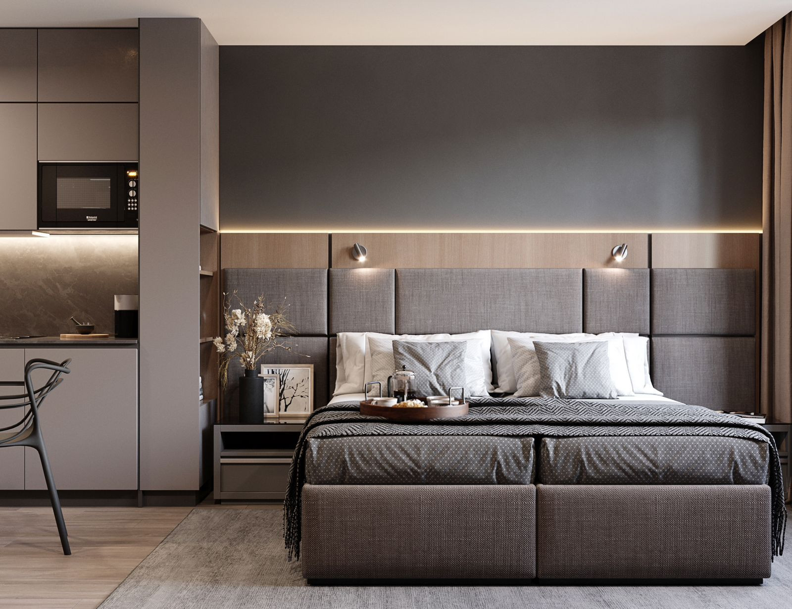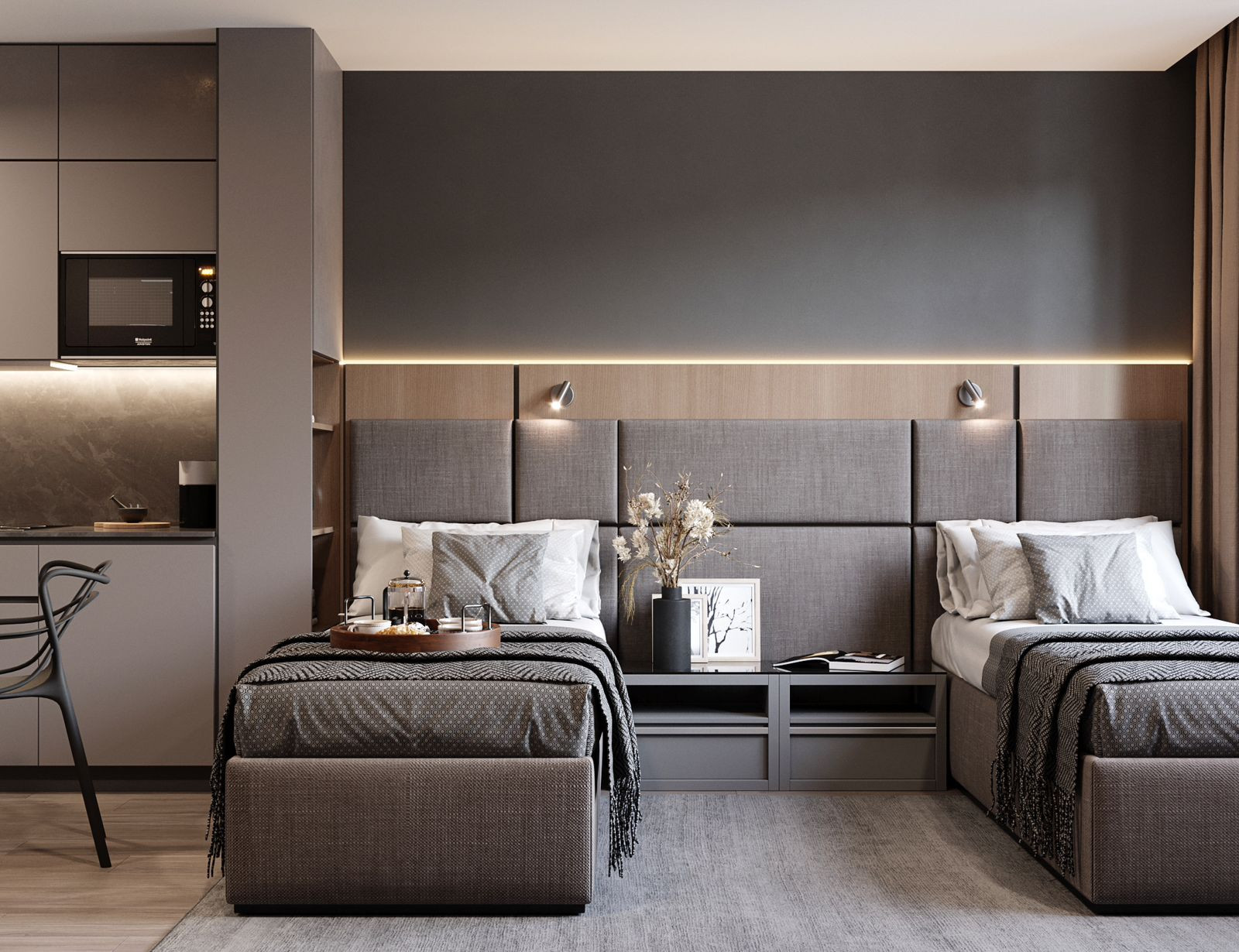 Сами юниты: на полу высококачественный ламинат 32 класса, потолок и стены оштукатурены и окрашены светлые и темные тона