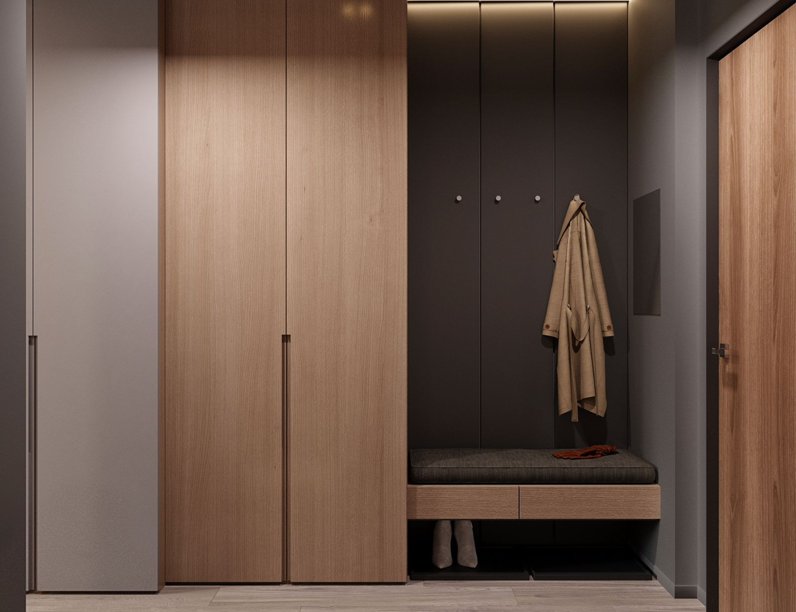 Прихожая: пол в прихожей будет отделан керамогранитом под мрамор, стены и потолок - оштукатурены и окрашены