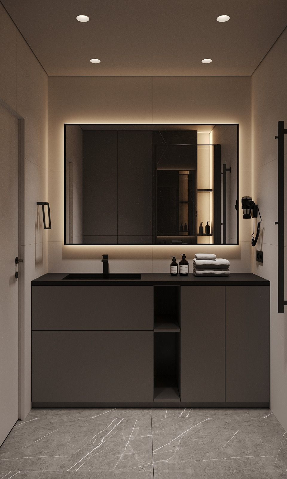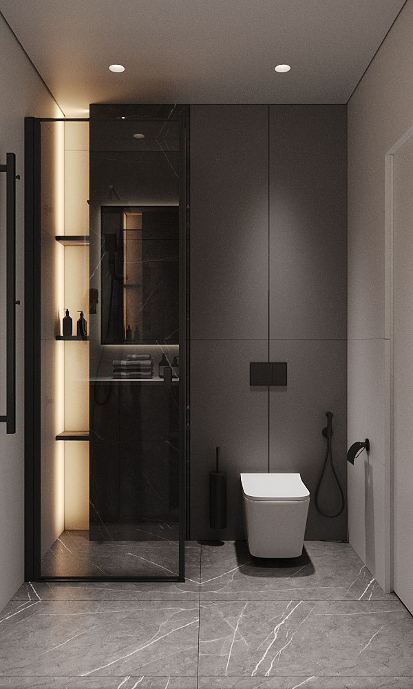 Санузел: полы в санузле будут отделаны керамогранитом под мрамор, стены в санузле будут отделаны керамогранитом под бетон. На потолках натяжной водонепроницаемый потолок.