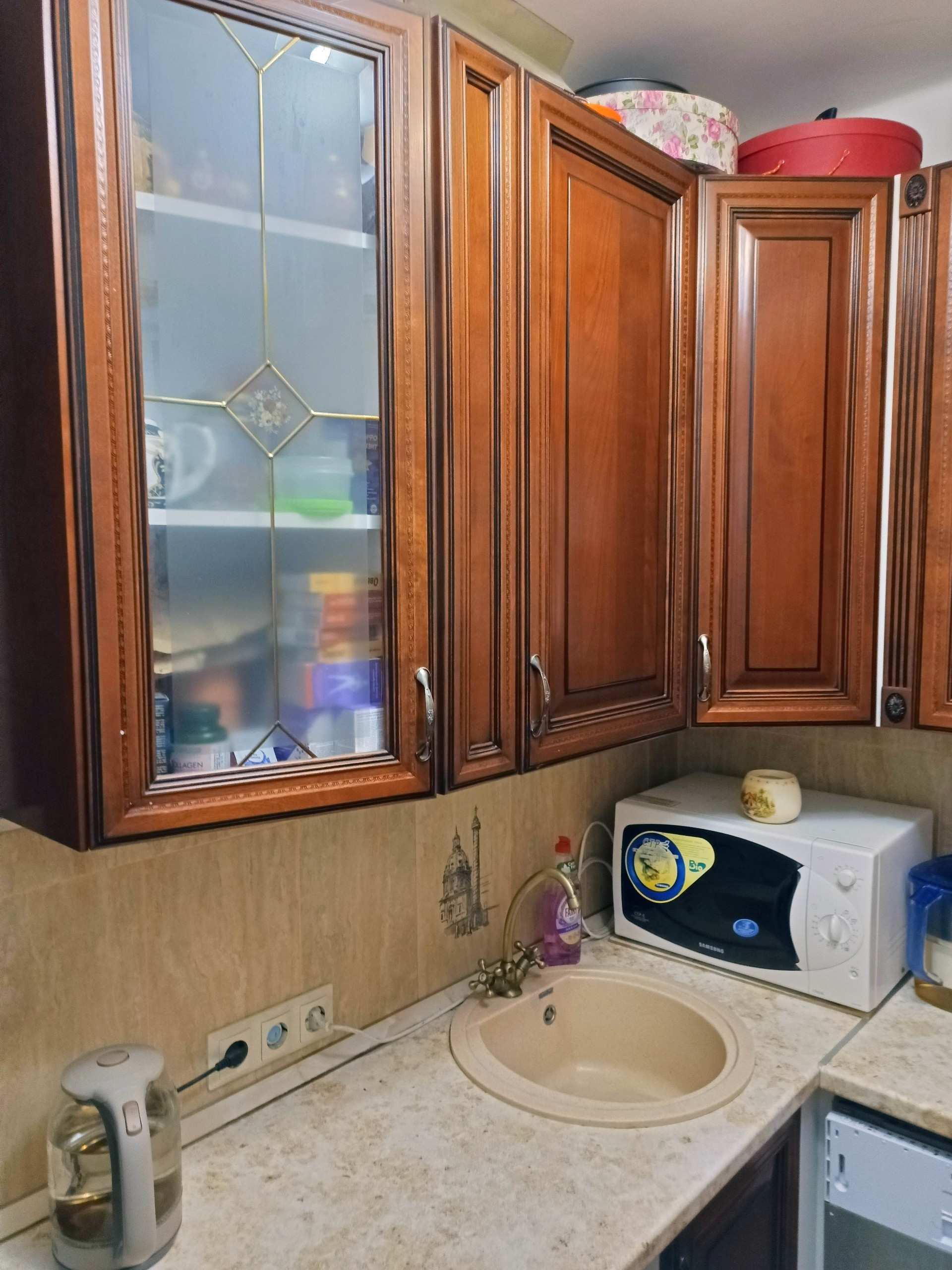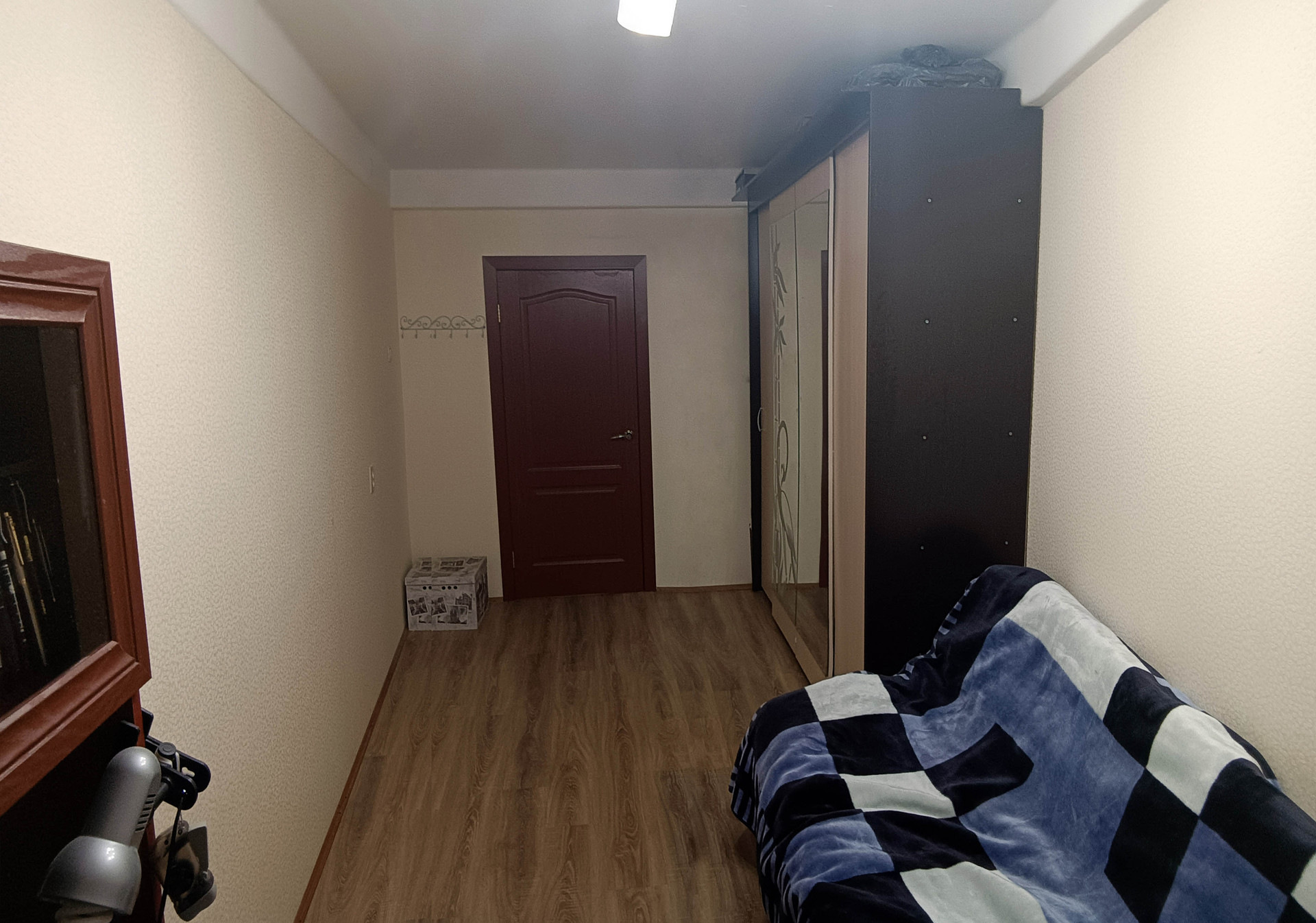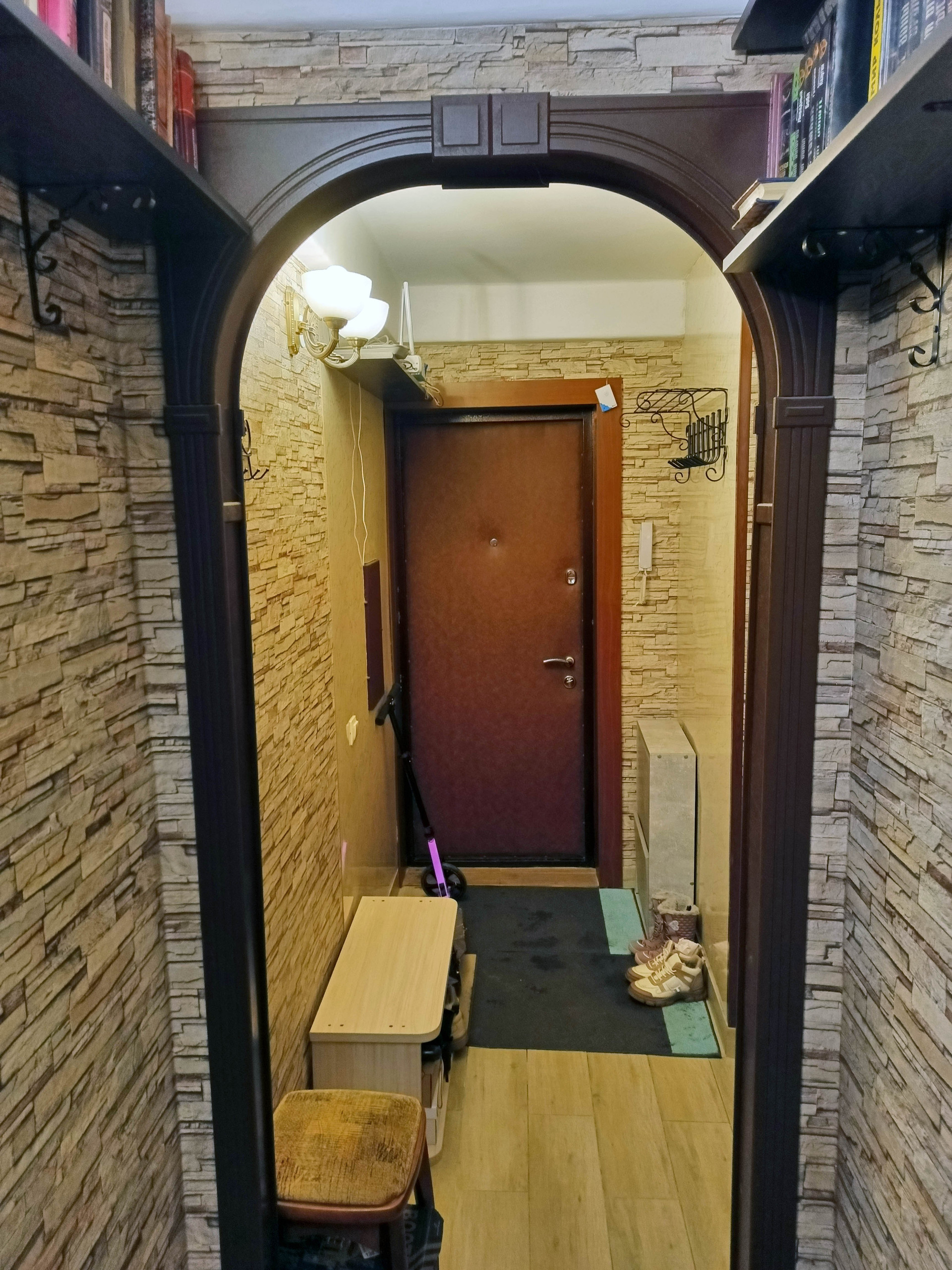На кухне оставляем гарнитур высокого класса: фасады из массива карельской берёзы, с витражами. Так же оставляем вместительный 4х-дверный шкаф-купе с двумя зеркалами. В торце коридора небольшая кладовка, в которой две штанги для вешалок, за ними регулируемые по высоте полки, несмотря на компактность кладовка имеет высокую функциональность. Стены везде ровные, ванна отделана кафелем, так же кафельный щит на кухне.