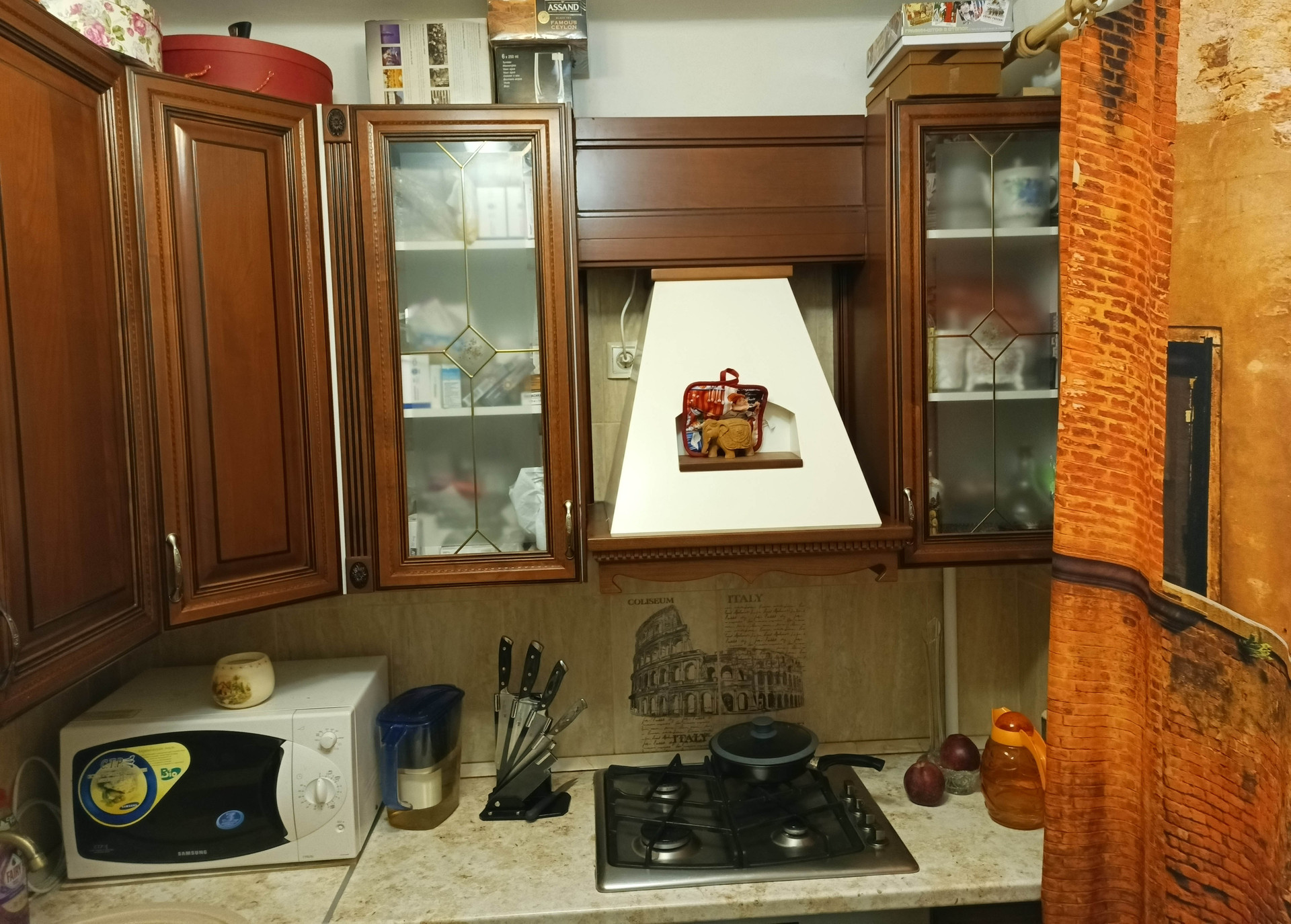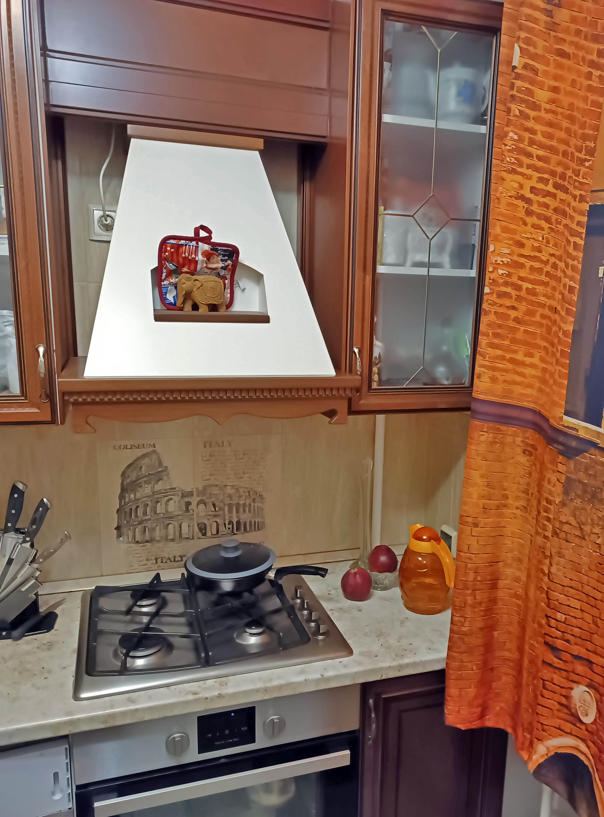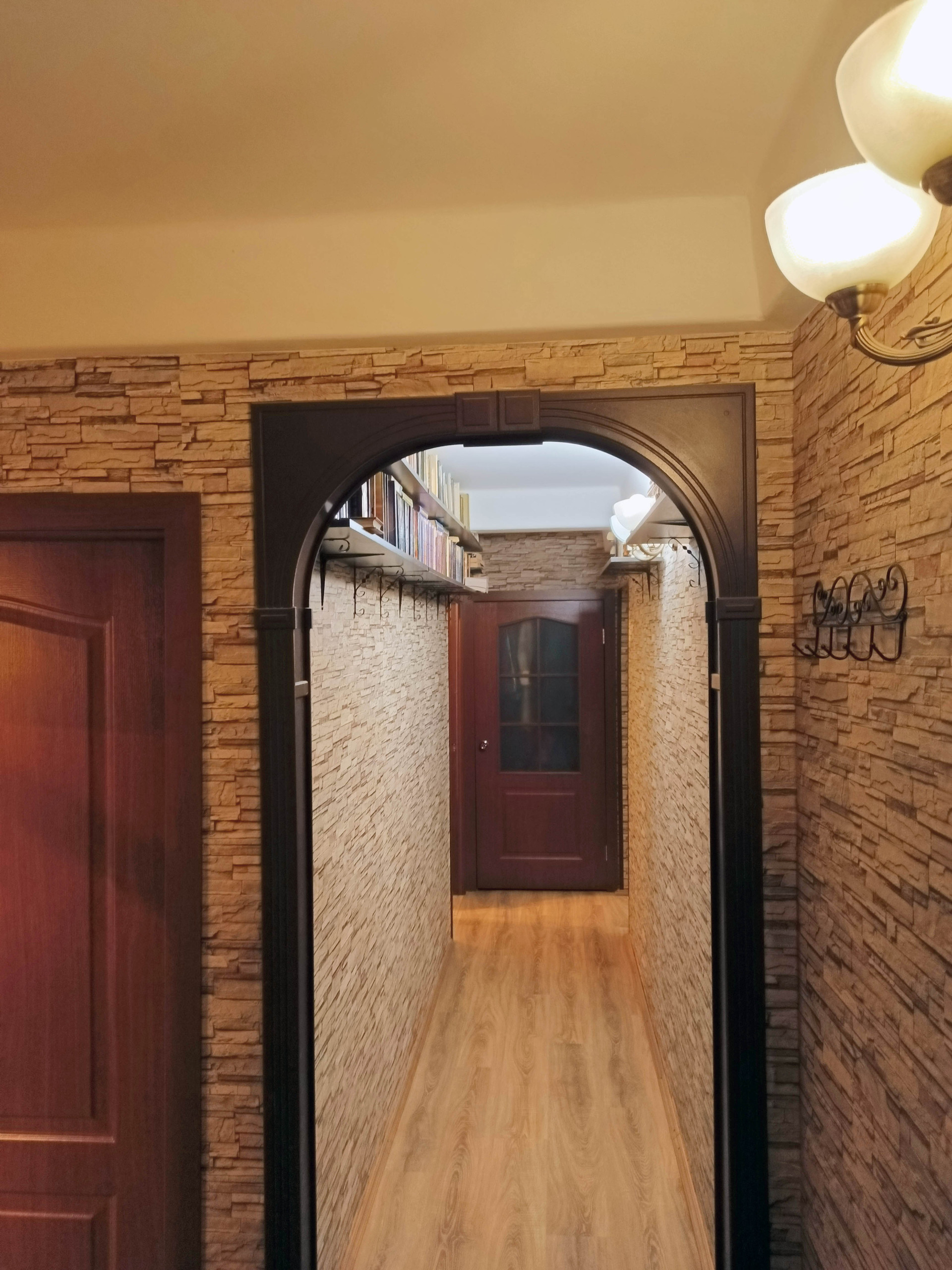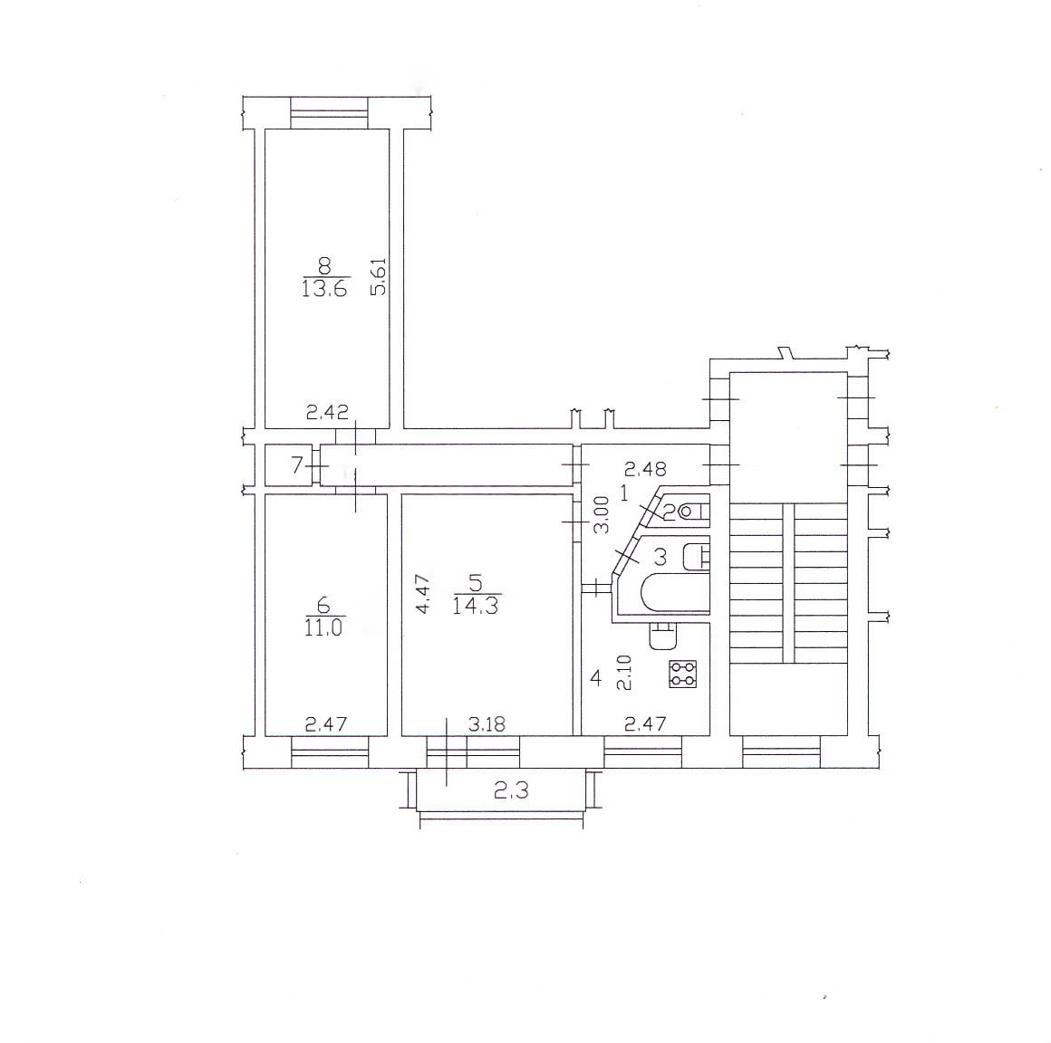 На кухне оставляем гарнитур высокого класса: фасады из массива карельской берёзы, с витражами. Так же оставляем вместительный 4х-дверный шкаф-купе с двумя зеркалами. В торце коридора небольшая кладовка, в которой две штанги для вешалок, за ними регулируемые по высоте полки, несмотря на компактность кладовка имеет высокую функциональность. Стены везде ровные, ванна отделана кафелем, так же кафельный щит на кухне.