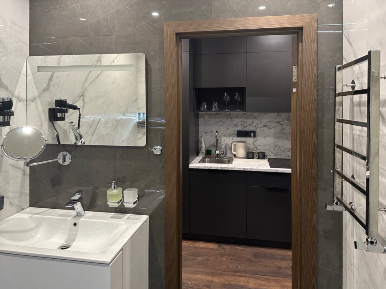 - Полностью оборудованная кухня с современной бытовой техникой