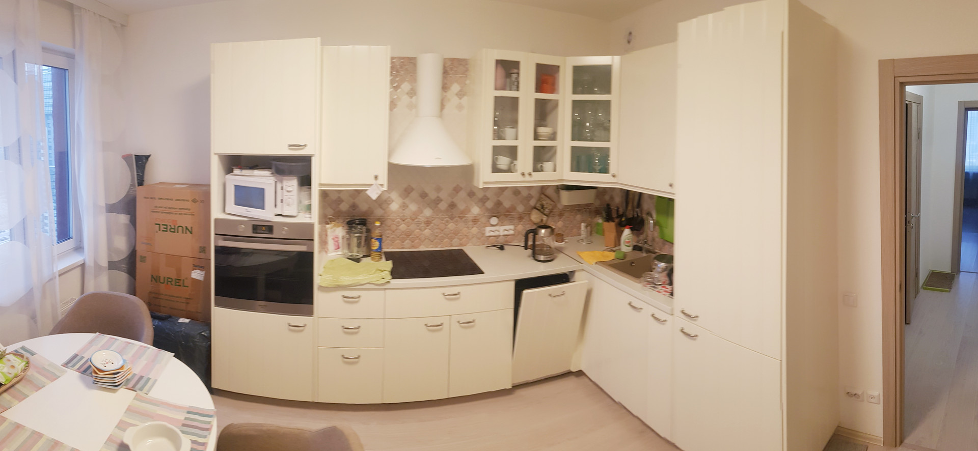 В прямой продаже большая двухсторонняя квартира с евроремонтом, мебелью и техникой.