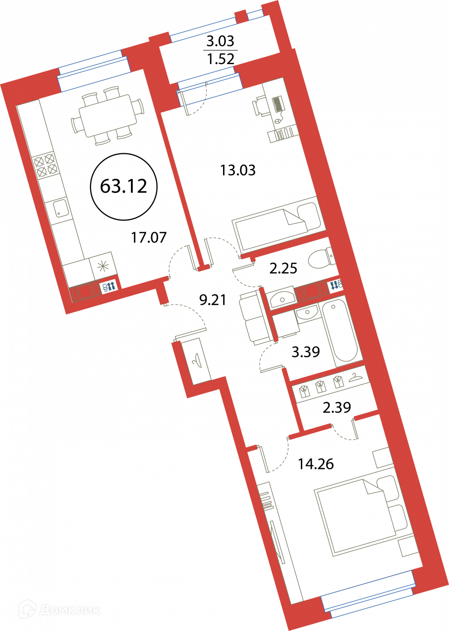 Общая площадь 63.12 м2