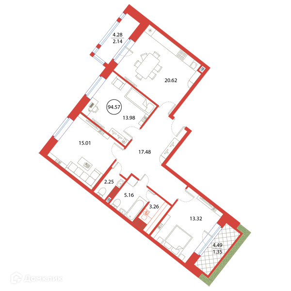 Общая площадь 94.57 м2