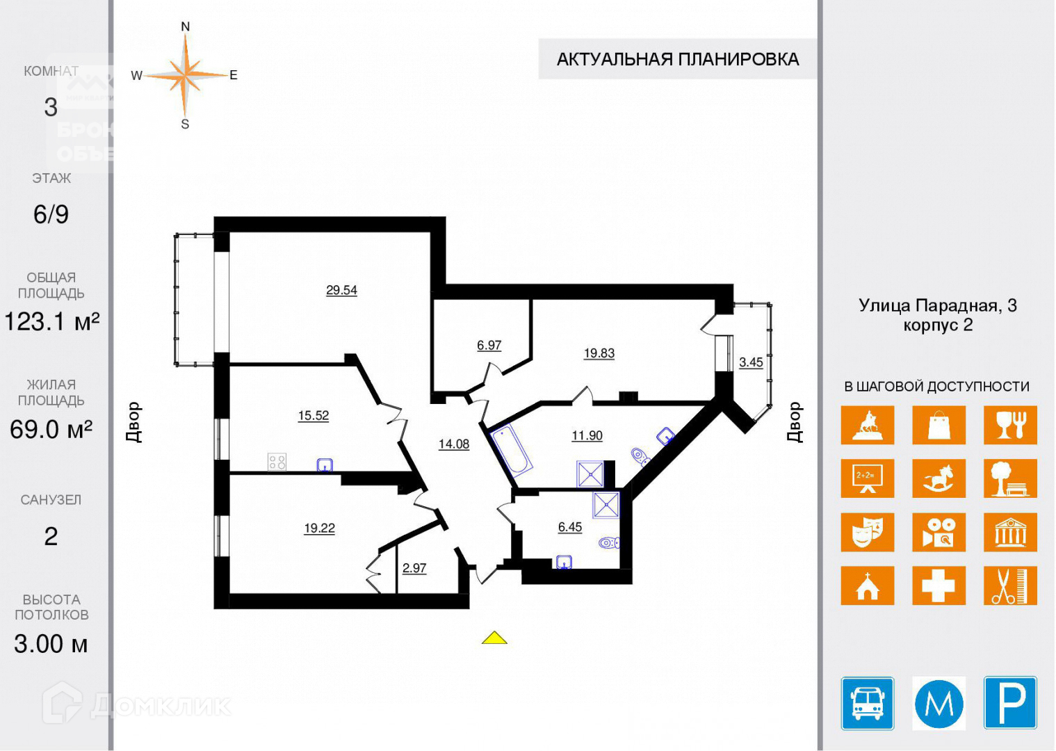 3-комнатная квартира, 123.1 м2, этаж 6 / 9, на продажу в Санкт-Петербурге, Парадная улица, 3к2