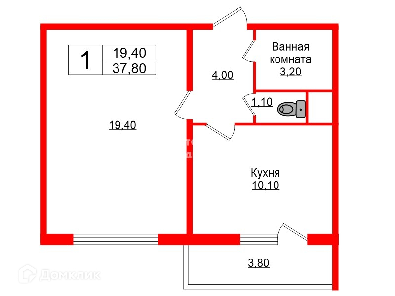 Общая площадь 37.8 м2