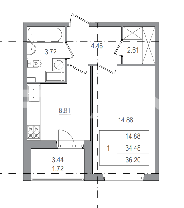 Балкон, лоджия 1 балкон