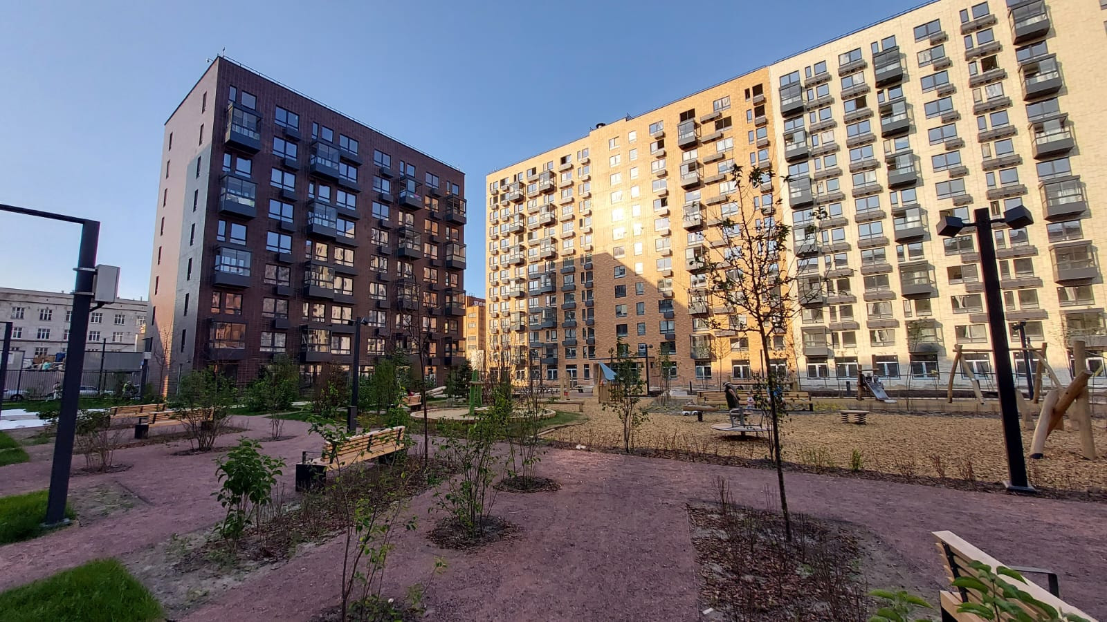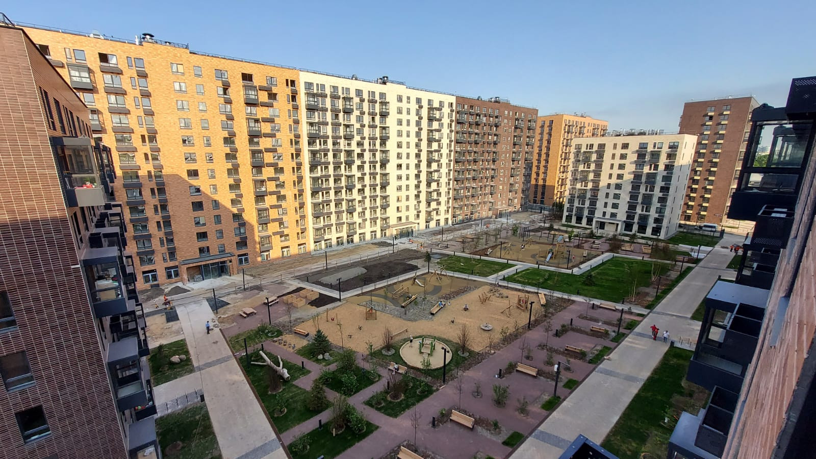 В ЖК дворы без машин, территория благоустроенна, озеленена, есть детские и спортивные площадки. Два наземных паркинга на 794 машино-места, которые располагаются за пределами дворов.