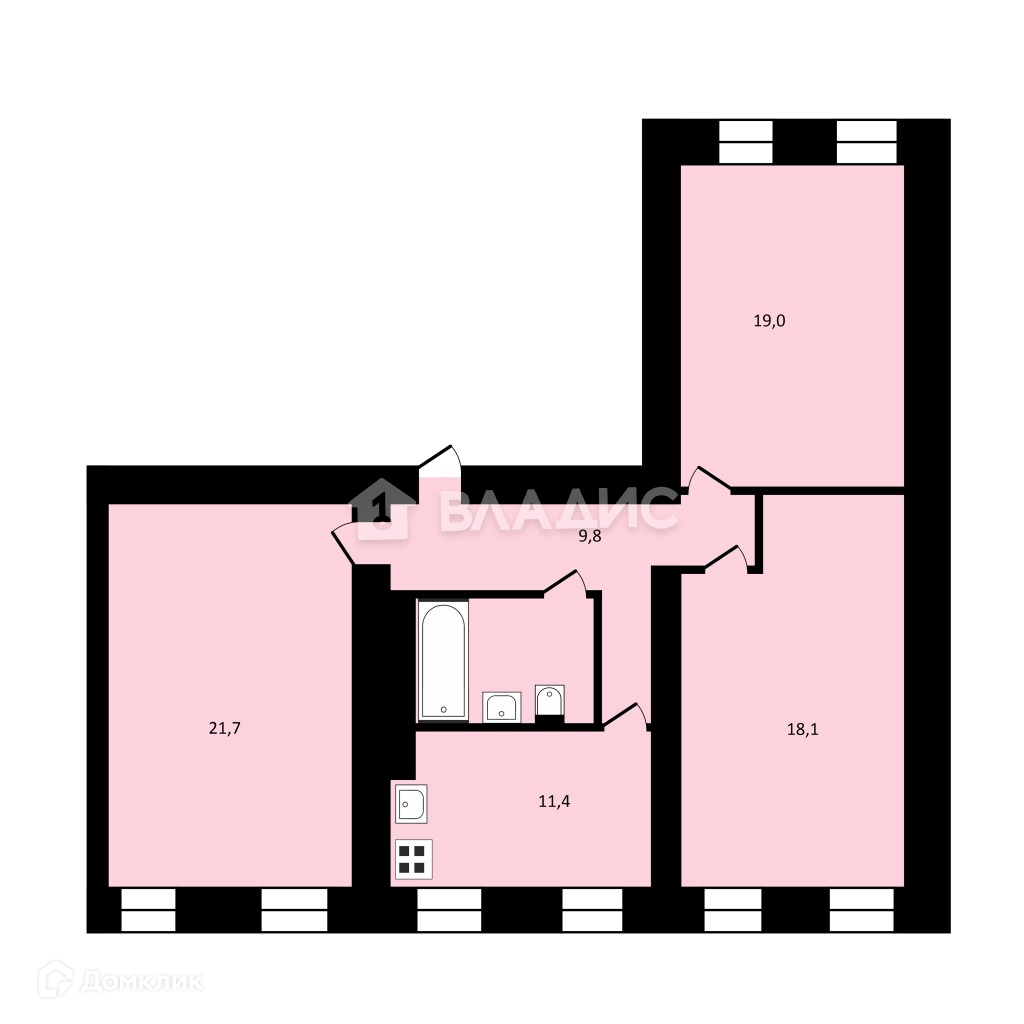 - жилая площадь - 58,8 кв.м (21,7 + 18,1 + 19,0 кв.м)