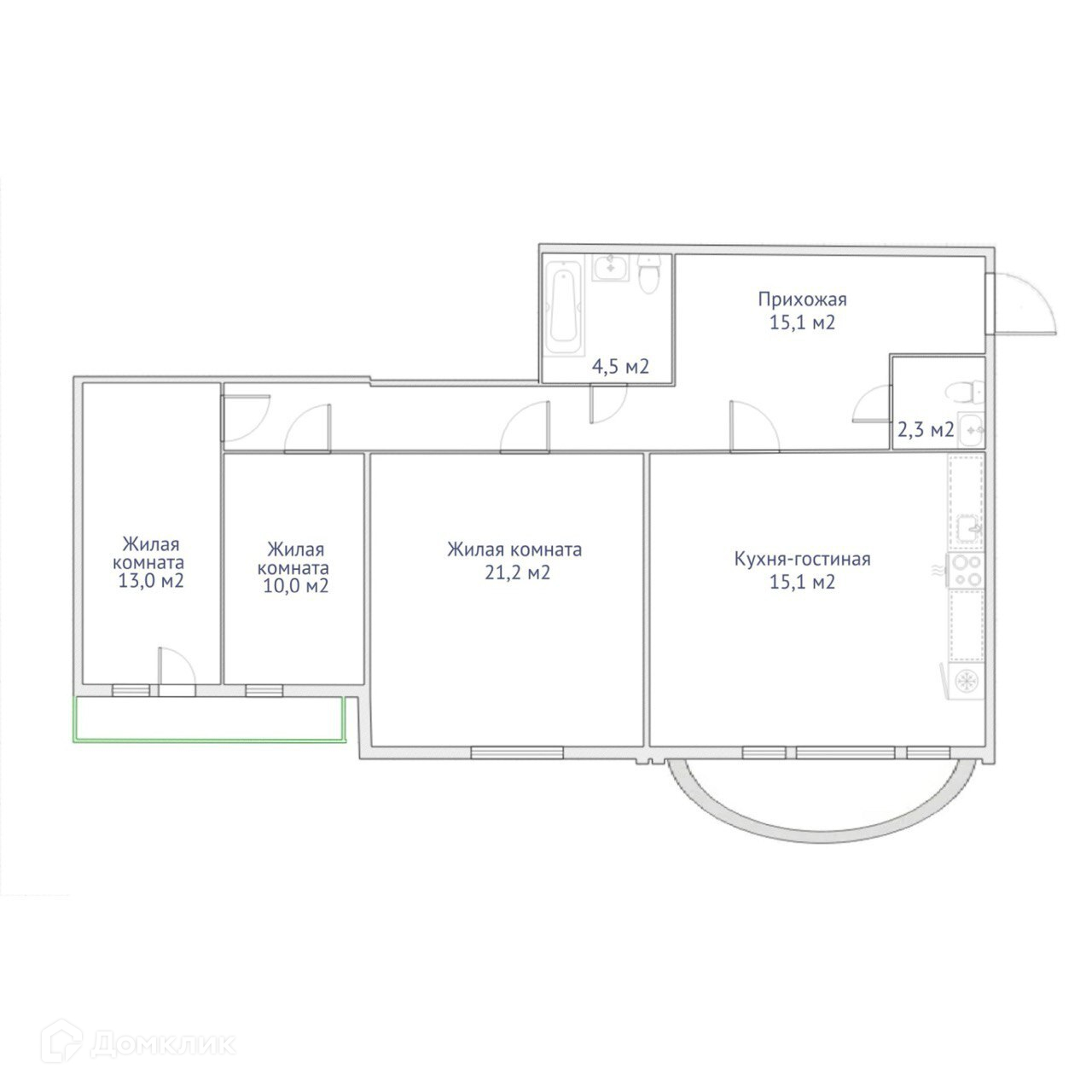 Жилая площадь 44.2 м2