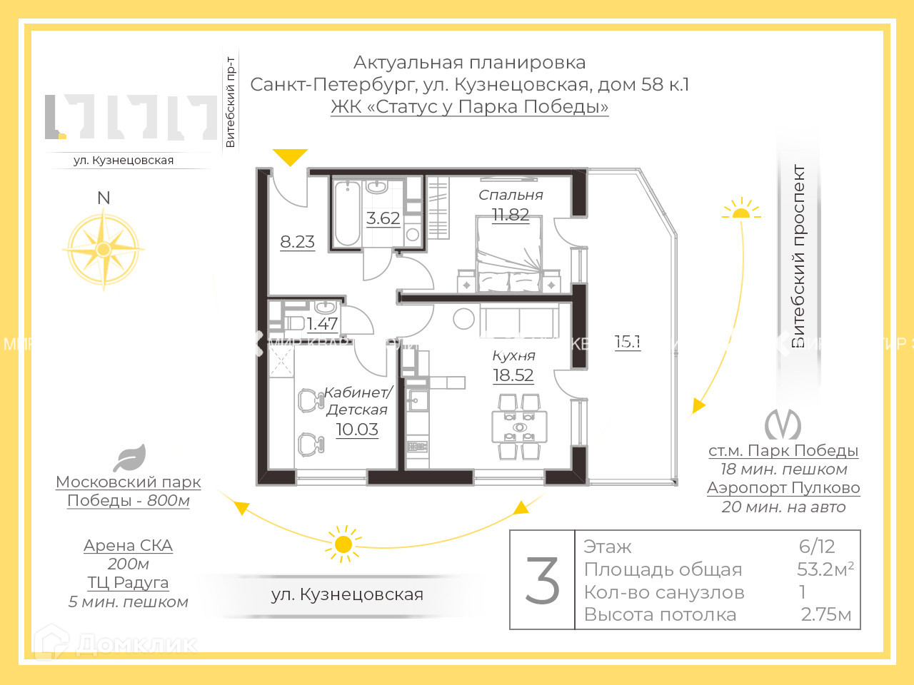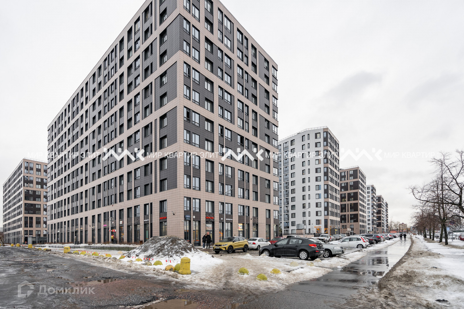 Комплекс построен по современной технологии с применением навесных вентилируемых фасадов и зеркального светоотражающего остекления. В составе комплекса детский сад с классами начальной школы, на первых этажах магазины, кафе, аптеки и пекарня . Уютные дворы оборудованы детскими площадками и местами для отдыха. Придомовая территория огорожена по периметру, система контроля доступа. Камеры видеонаблюдения установлены по периметру домов, при входе в парадную,в холлах, в лифтах и на детских площадках. Для автомобилей подземный отапливаемый паркинг. Напротив дома действующий торговый комплекс Радуга, кинотеатры, продуктовые магазины, строительный магазин ОБИ, магазины одежды. До метро Парк Победы можно прогуляться пешком через красивейший Московский Парк Победы. Аэропорт Пулково расположен в пятнадцати километрах от дома.