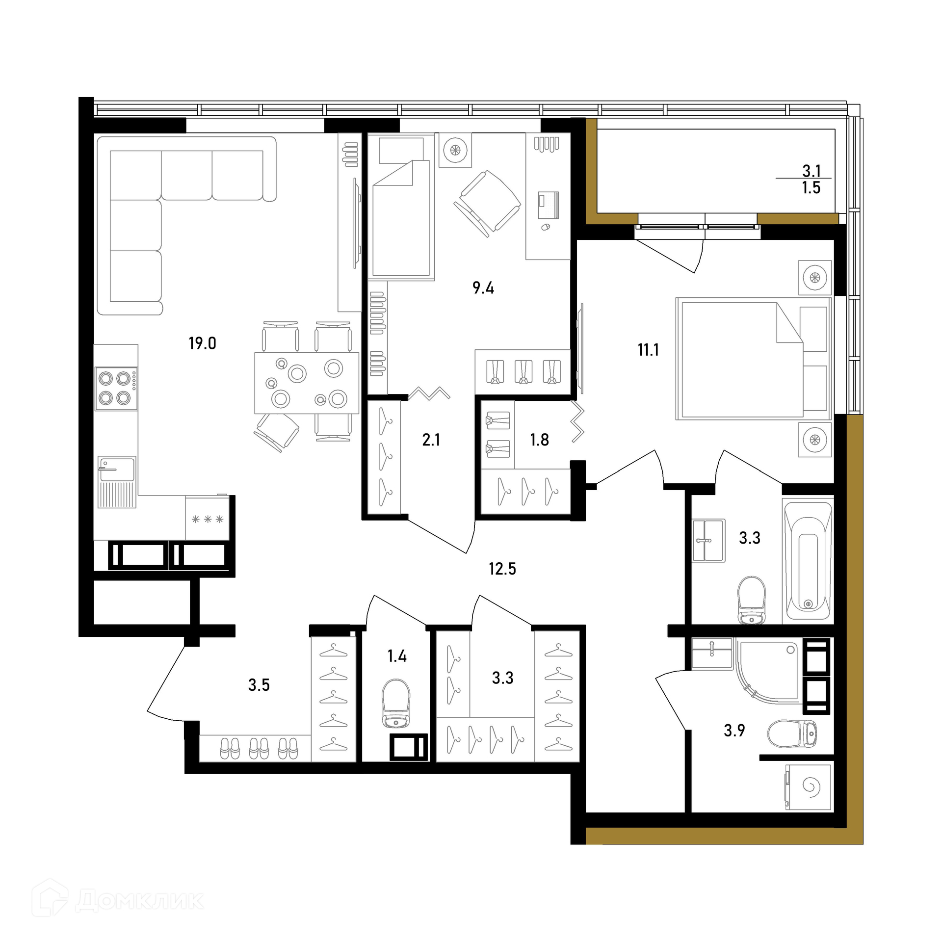 Площадь кухни 19 м2