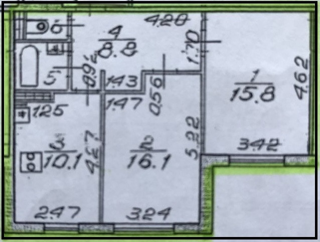 Общая площадь квартиры 54,3 кв.м. Комнаты изолированные 16,1 и 15,8 кв.м., кухня 10,1 кв.м., большой холл 8,8 кв.м. Санузел раздельный. 2/12 этаж. Закрытый коридор на две квартиры.
