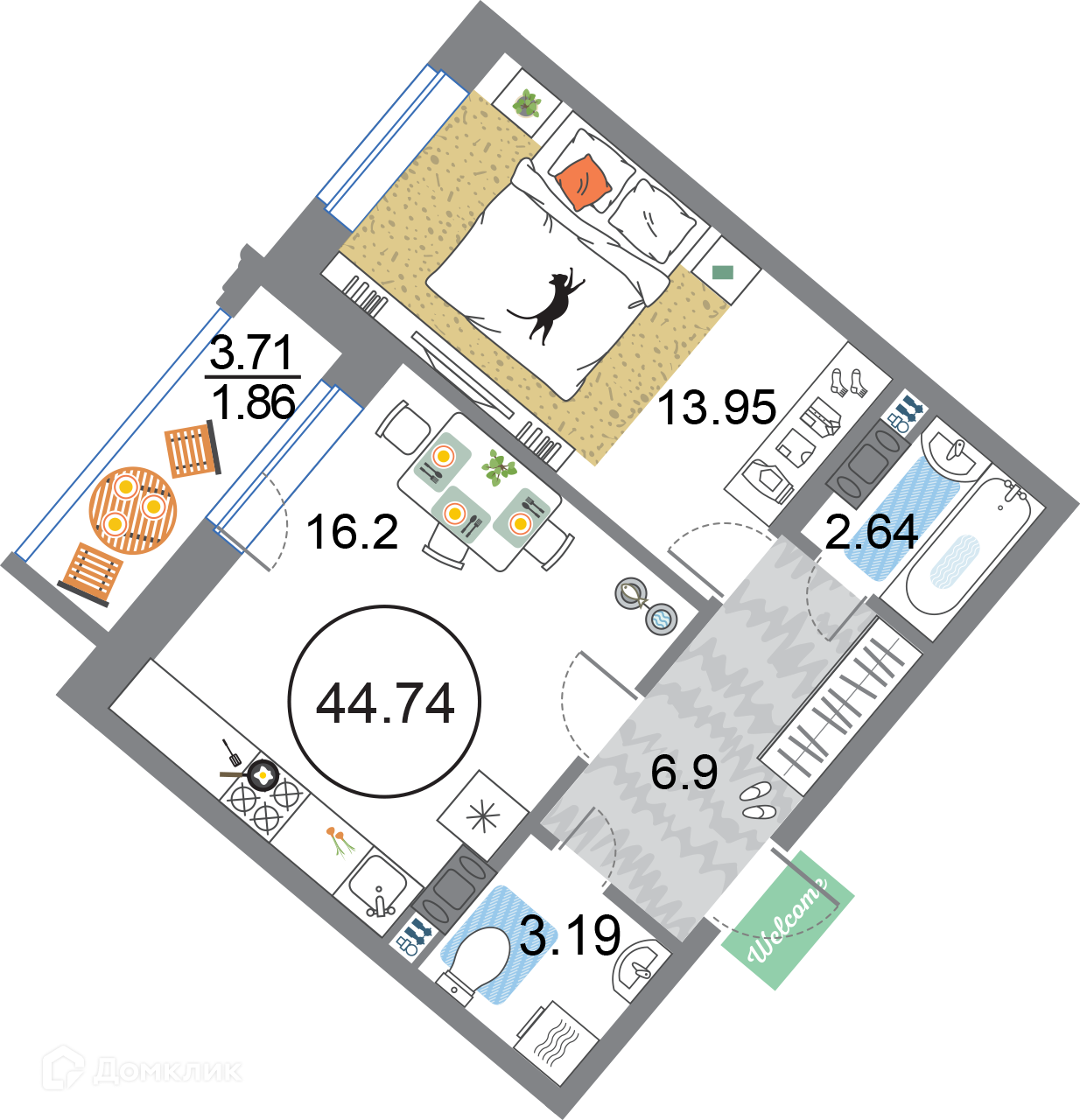 Общая площадь 44.74 м2