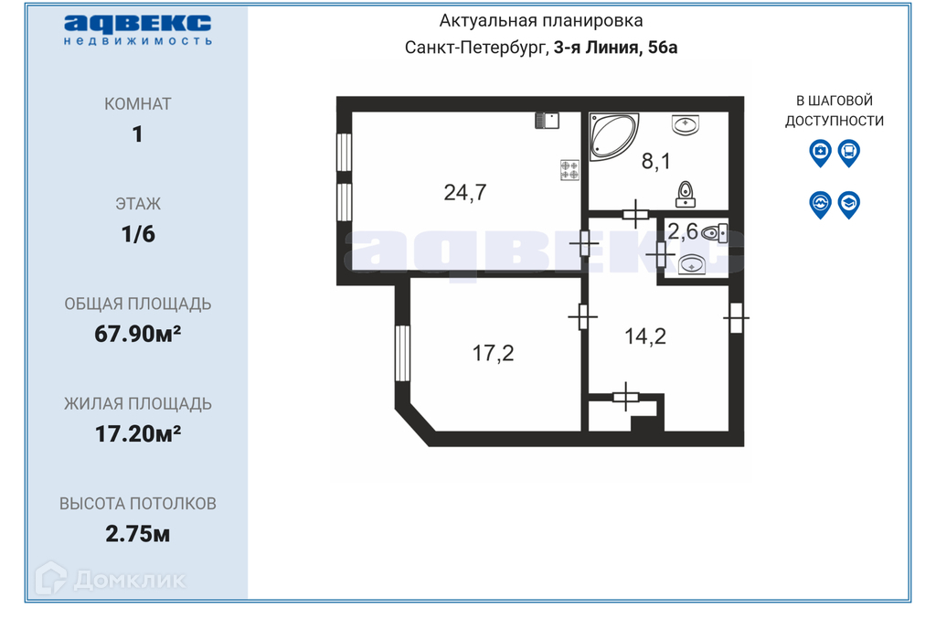 1-комнатная квартира, 67.9 м2, этаж 1 / 6, на продажу в Санкт-Петербурге, 3-я линия Васильевского острова, 56