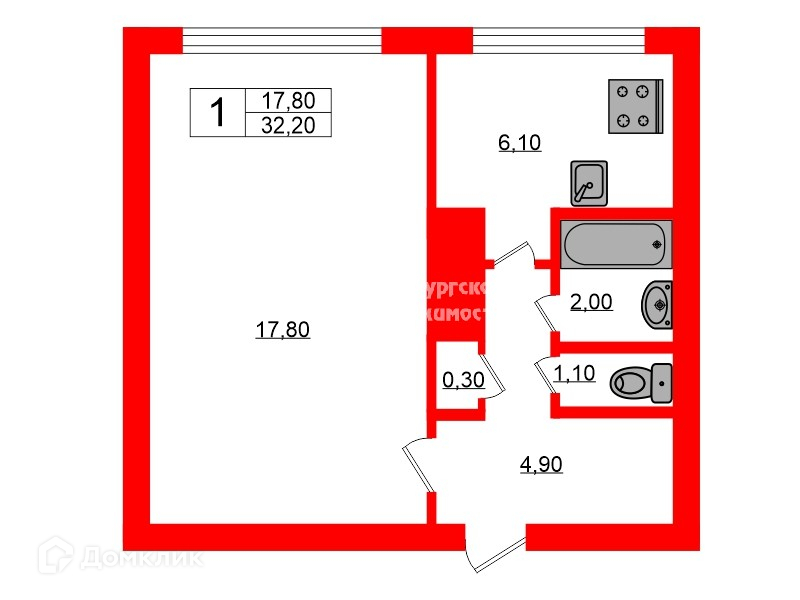Общая площадь 32.2 м2