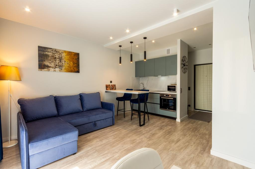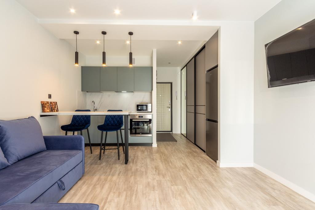 Компактная кухня оснащена духовым шкафом, варочной поверхностью, микроволновой печью и вытяжкой. Зона отдыха со стильным диваном и TV, а также рабочее место. В прихожей встроенная вместительная система хранения. Совмещённый су с полноценной ванной. Остеклённый балкон 3 кв. м. Потолки 2,7 м.