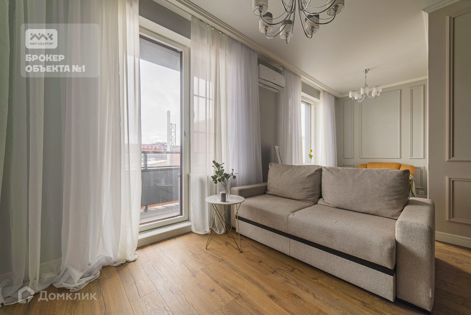 Квартира общей площадью 45м. + просторный балкон 5 м. ( не входит в общую площадь ), расположена на 6 этаже, очень светлая, солнечная, установлены большие деревянные окна скандинавского типа Scaala.