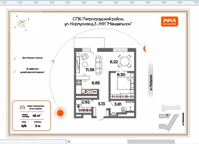 Дом бизнес-класса Мендельсон, 2018 года постройки от зарекомендовавшего себя застройщика «Балтийская коммерция» расположен на Корпусной улице в непосредственной близости от Крестовского острова и метро Чкаловская.