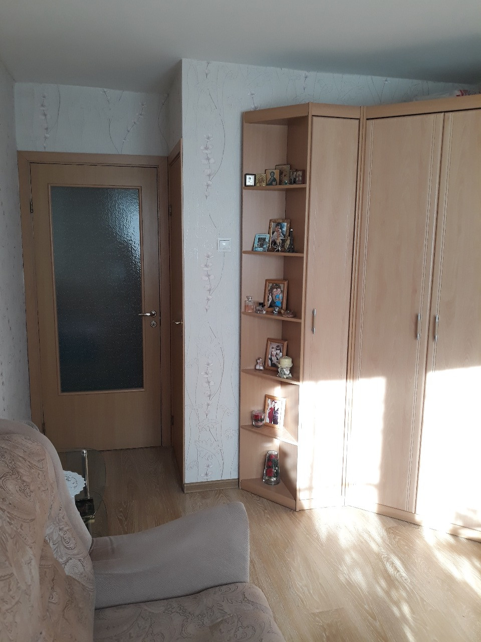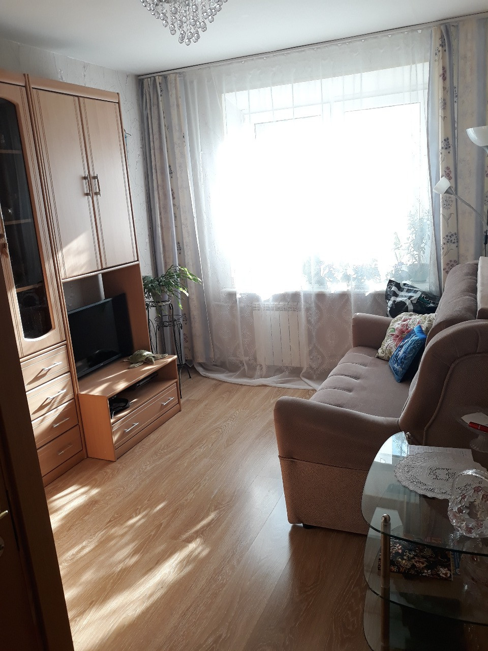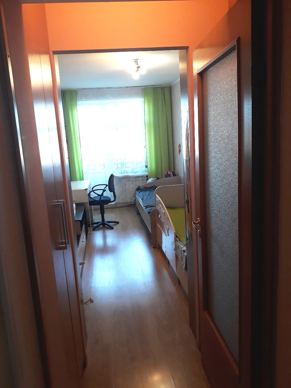 Трехкомнатная двухсторонняя уютная квартира с хорошим  ремонтом, комнаты изолированные 17м+12,7м+10,4м, балкон, кладовка, два встроенных шкафа, в комнатах и коридоре полы - ламинат, в ванной, туалете и на кухне полы - керамическая плитка. В прихожей большой вместительный зеркальный шкаф-купе. Более 5 лет. Встречная покупка.
