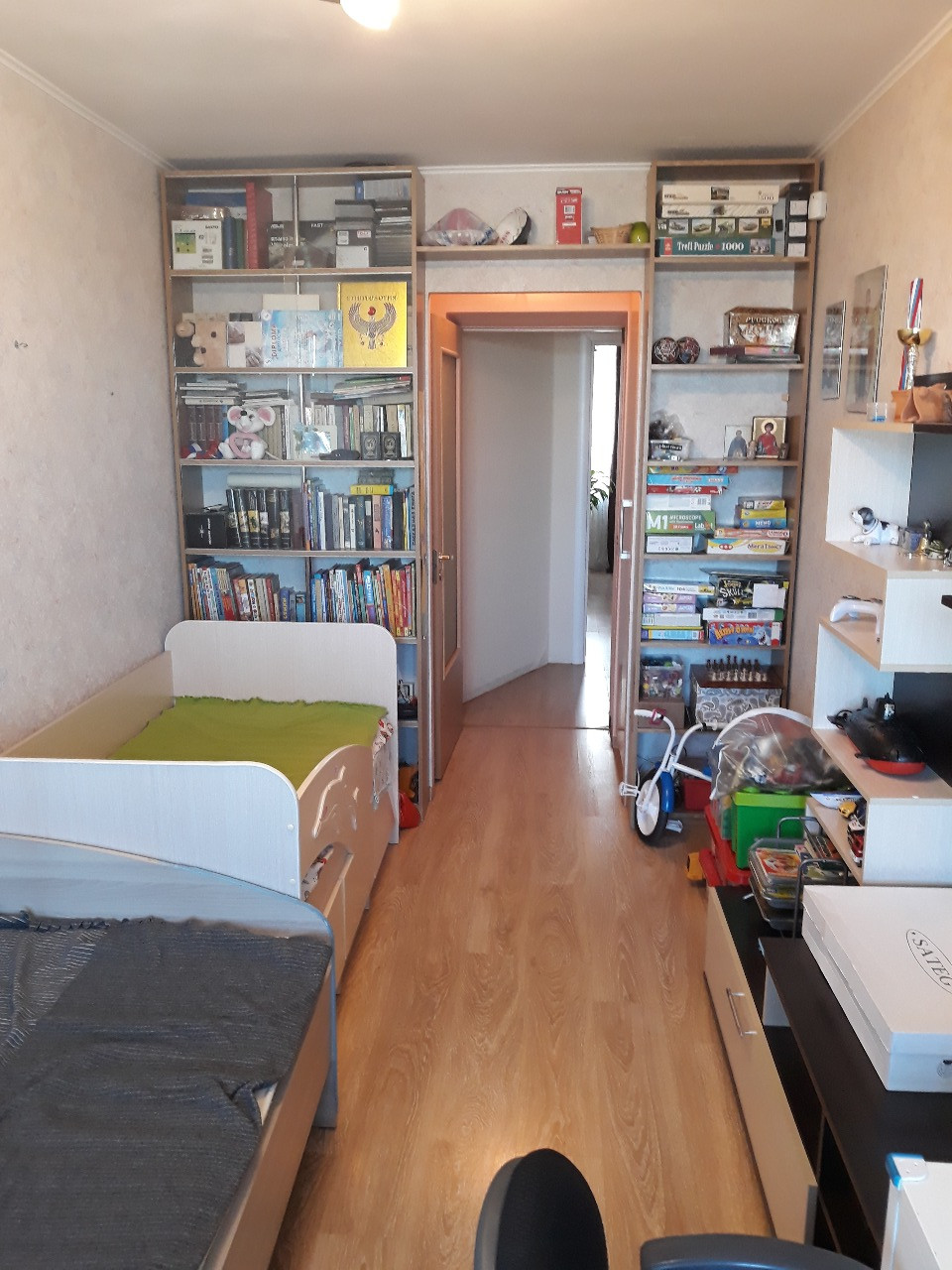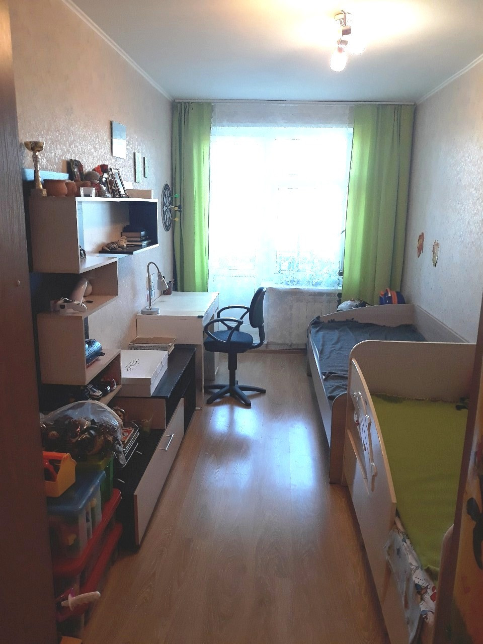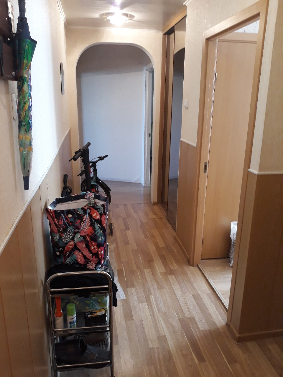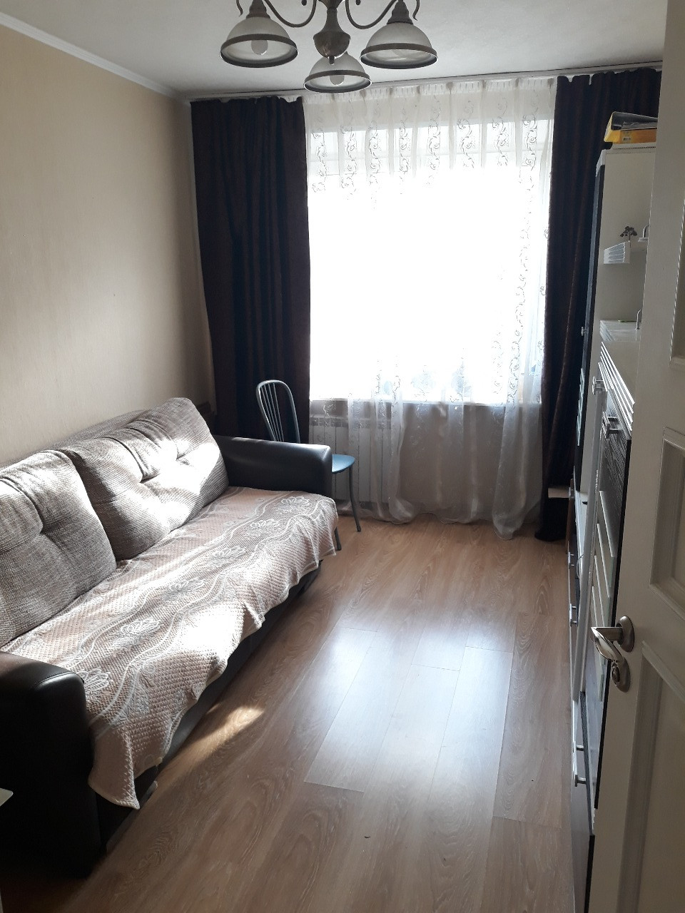 Трехкомнатная двухсторонняя уютная квартира с хорошим  ремонтом, комнаты изолированные 17м+12,7м+10,4м, балкон, кладовка, два встроенных шкафа, в комнатах и коридоре полы - ламинат, в ванной, туалете и на кухне полы - керамическая плитка. В прихожей большой вместительный зеркальный шкаф-купе. Более 5 лет. Встречная покупка.