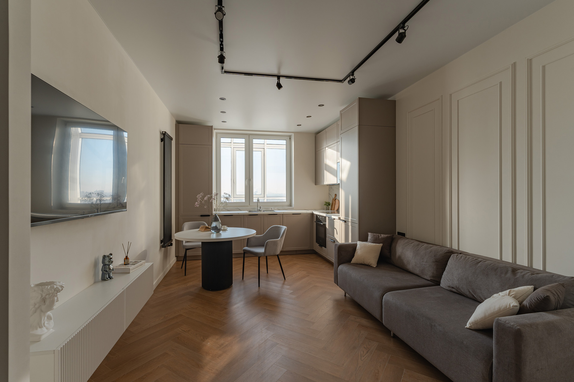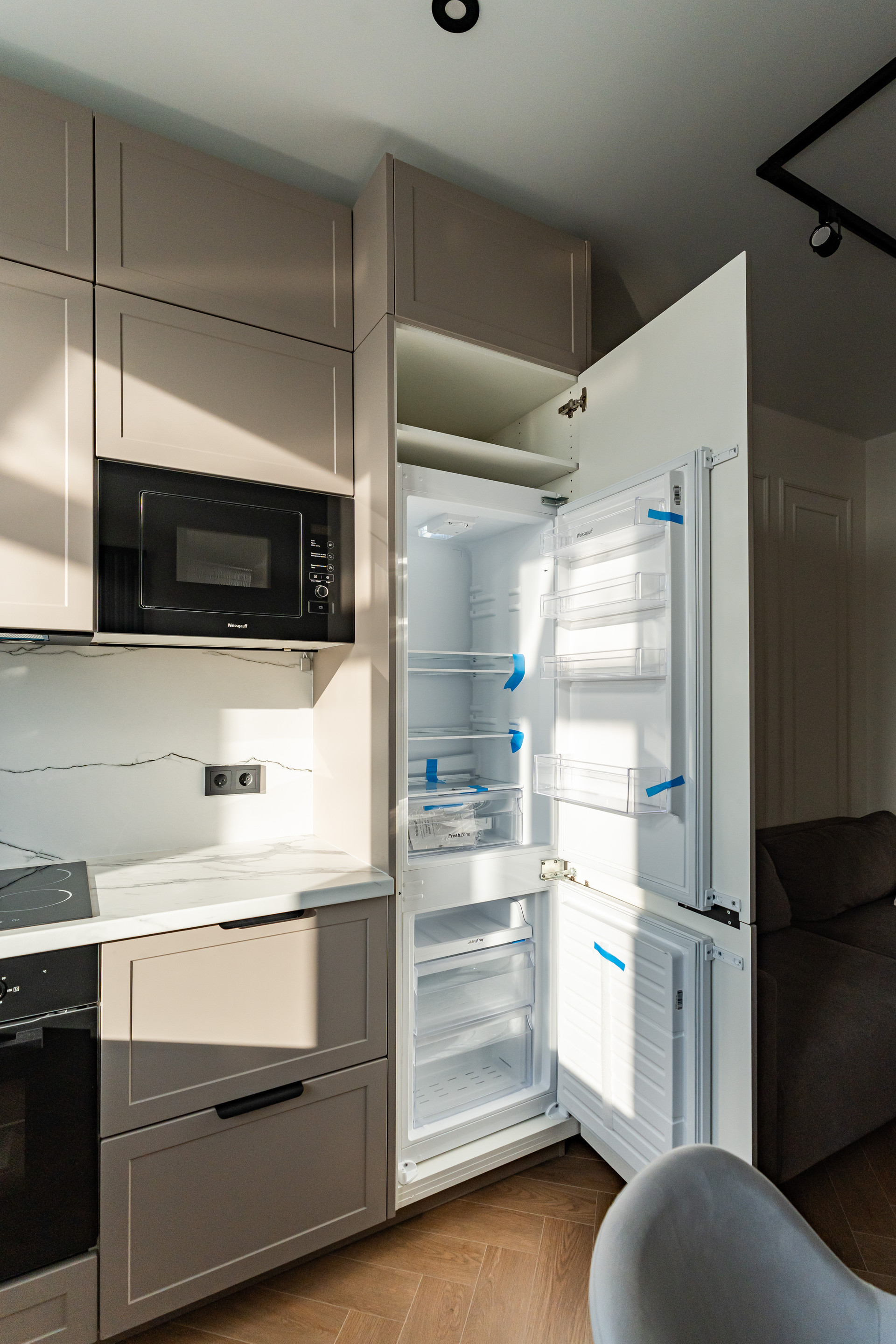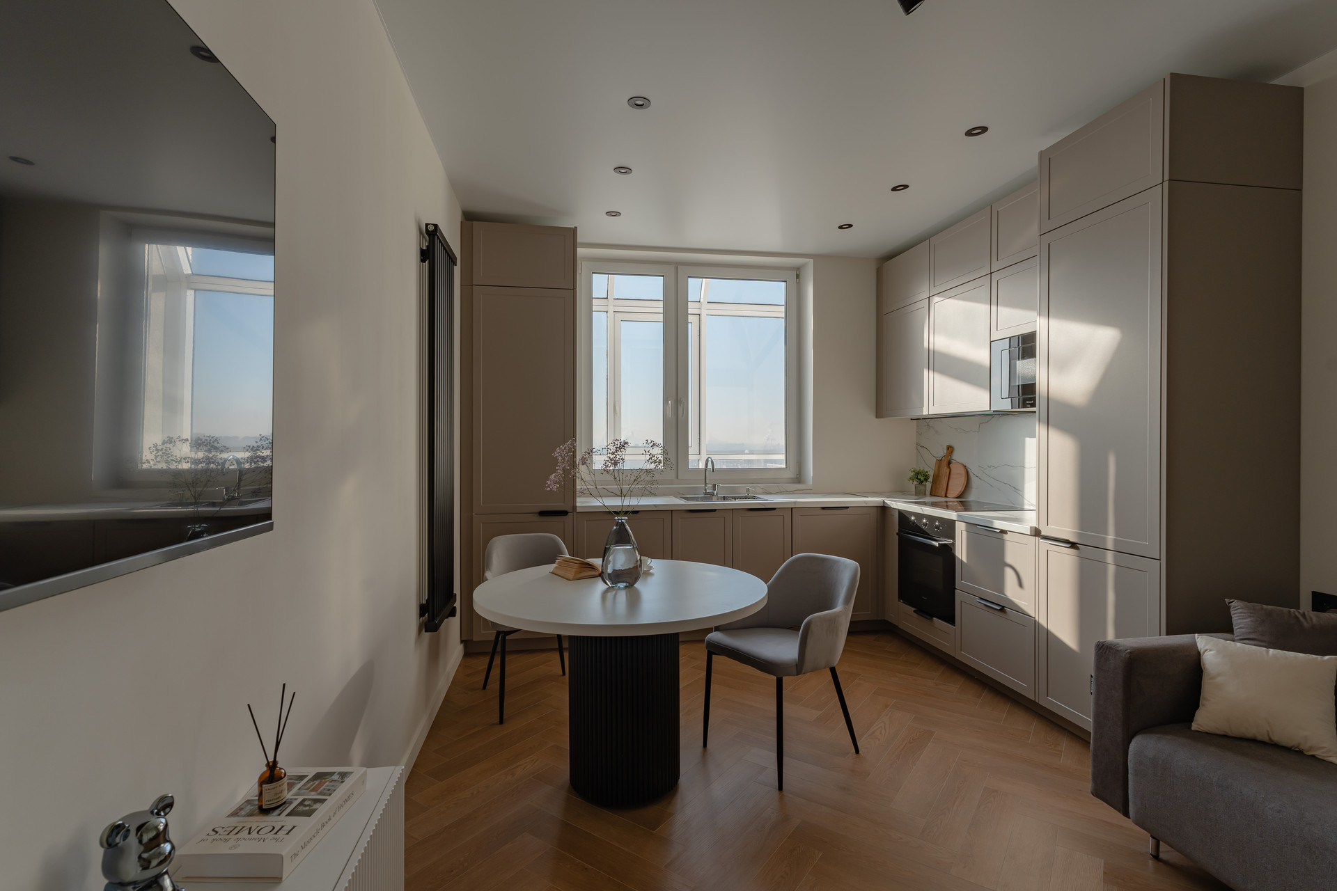 Есть абсолютно все для жизни, холодильник, варочная панель, духовой шкаф, посудомоечная машина, вытяжка, стиральная и сушильная машина, два больших смарт ТV - 55 дюймов с Яндекс Алисой.
