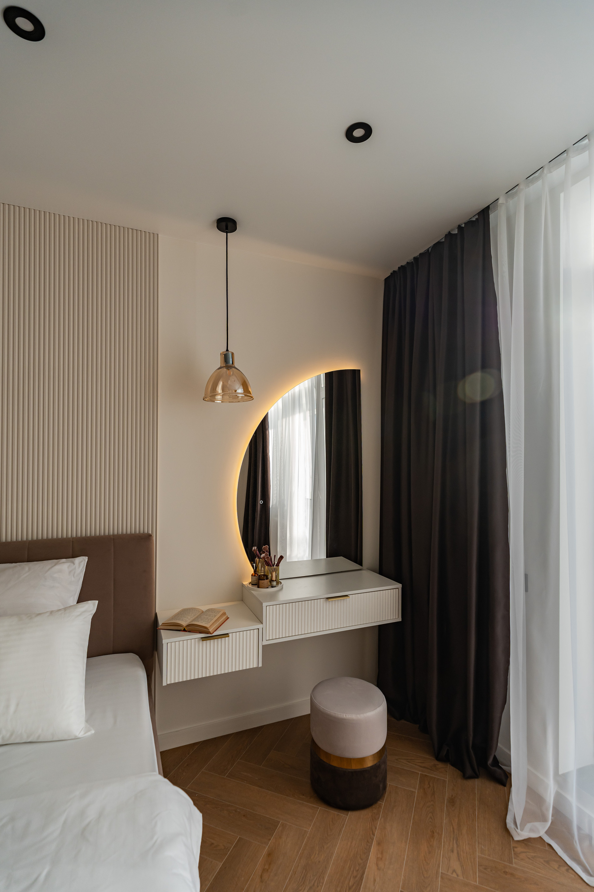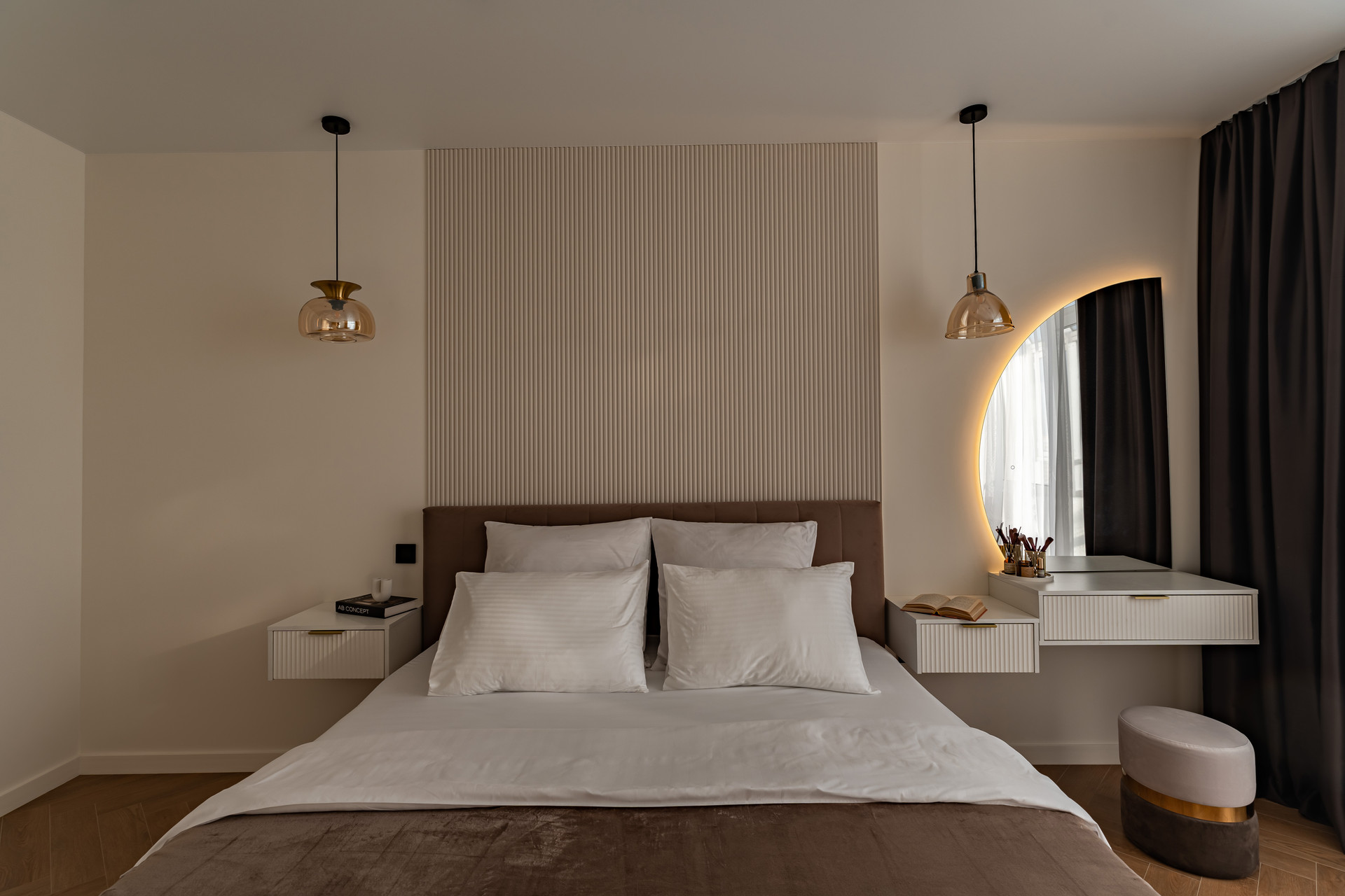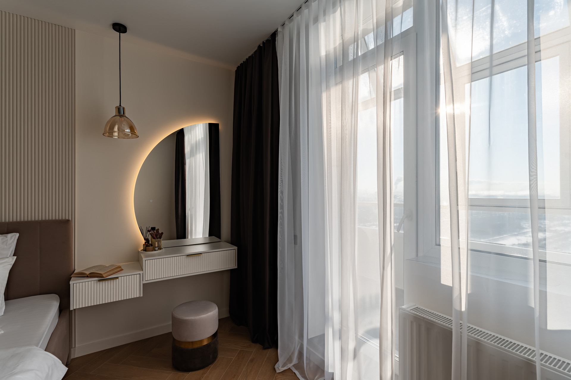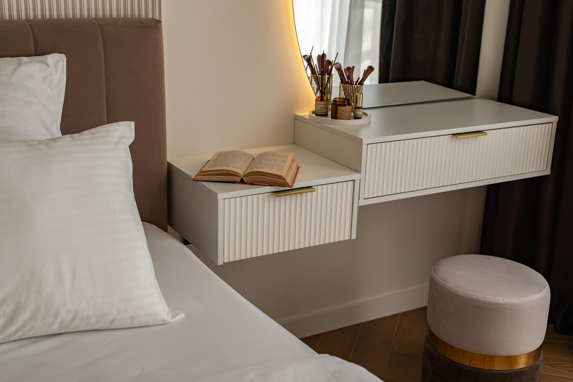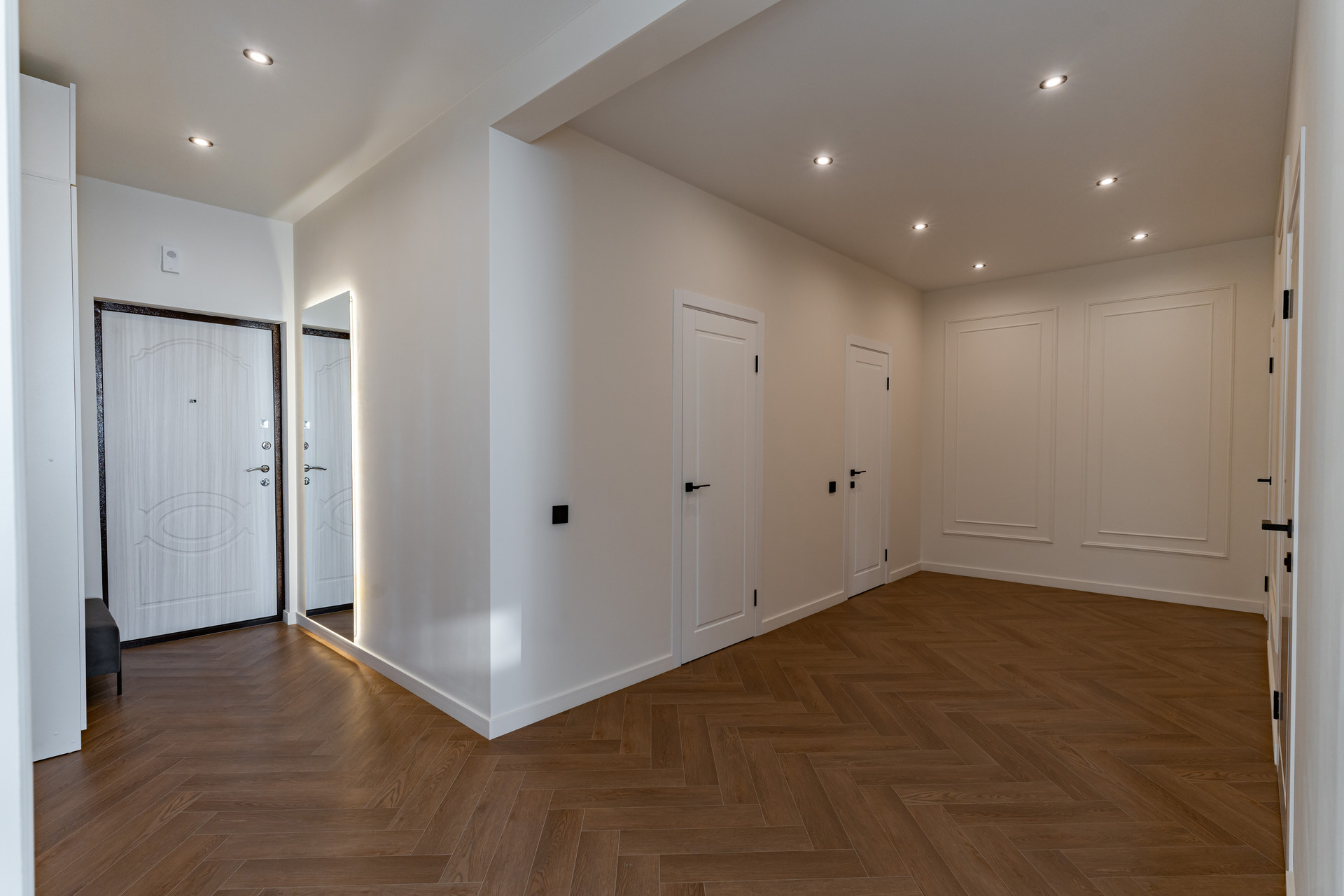 Новая мебель: кухонный гарнитур, кровать с подъемным механизмом 180х200см, матрац, стол и стулья кухонные, подвесные тумбочки, гардеробная комната, зеркала с подсветкой, встроенные шкафы.