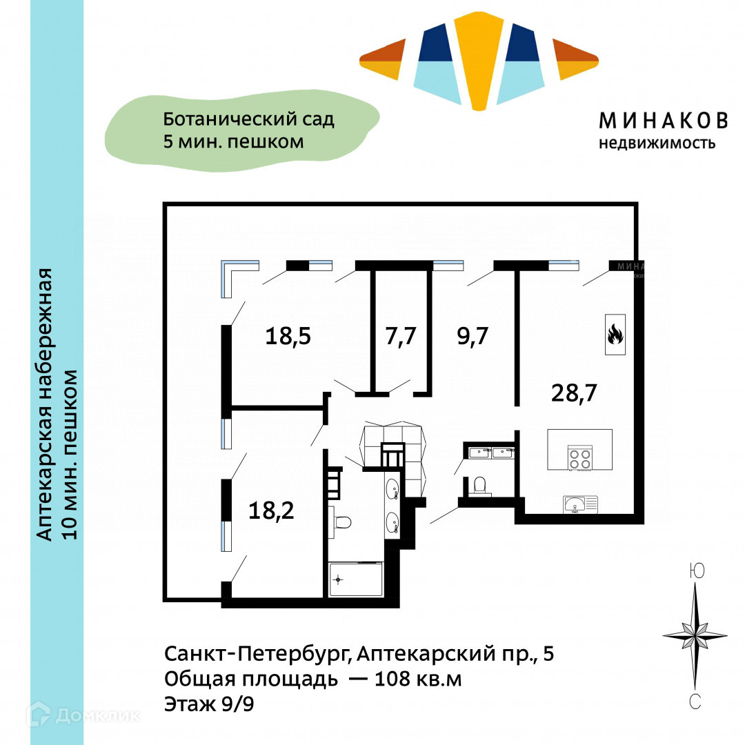 3-комнатная квартира, 107.9 м2, этаж 9 / 9, на продажу в Санкт-Петербурге, Аптекарский проспект, 5