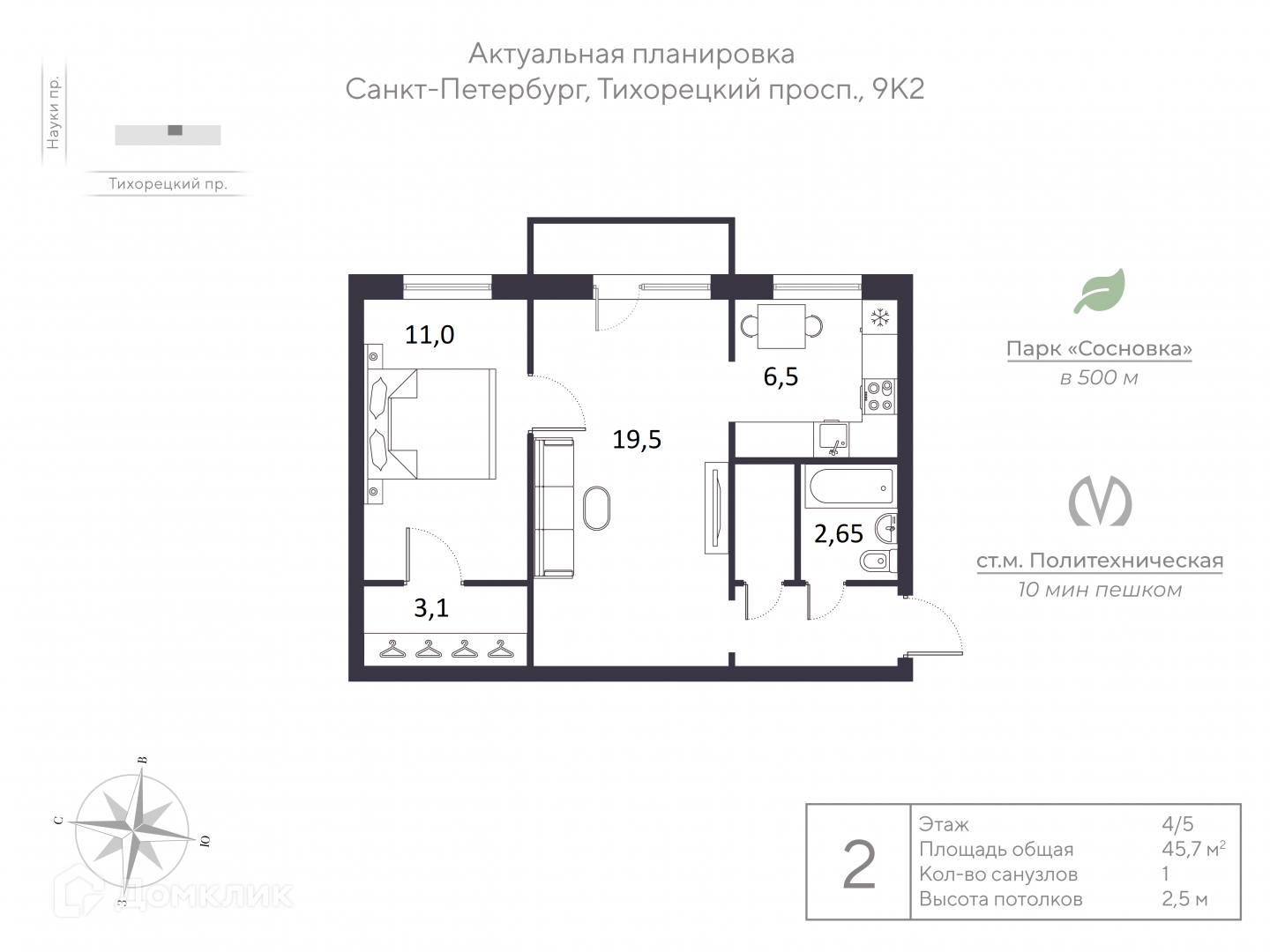 2-комнатная квартира, 45.6 м2, этаж 4 / 5, на продажу в Санкт-Петербурге, Тихорецкий проспект, 9к2