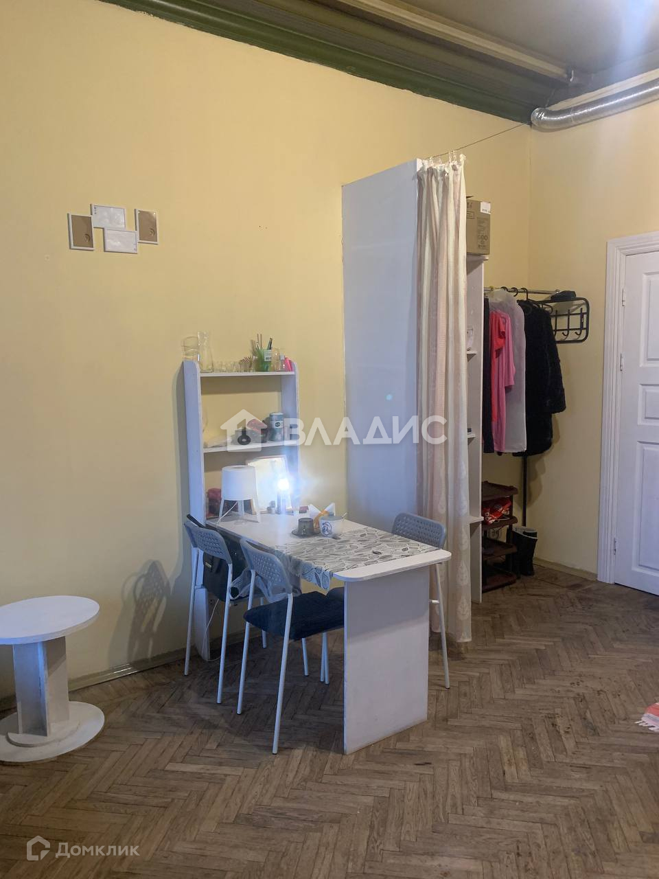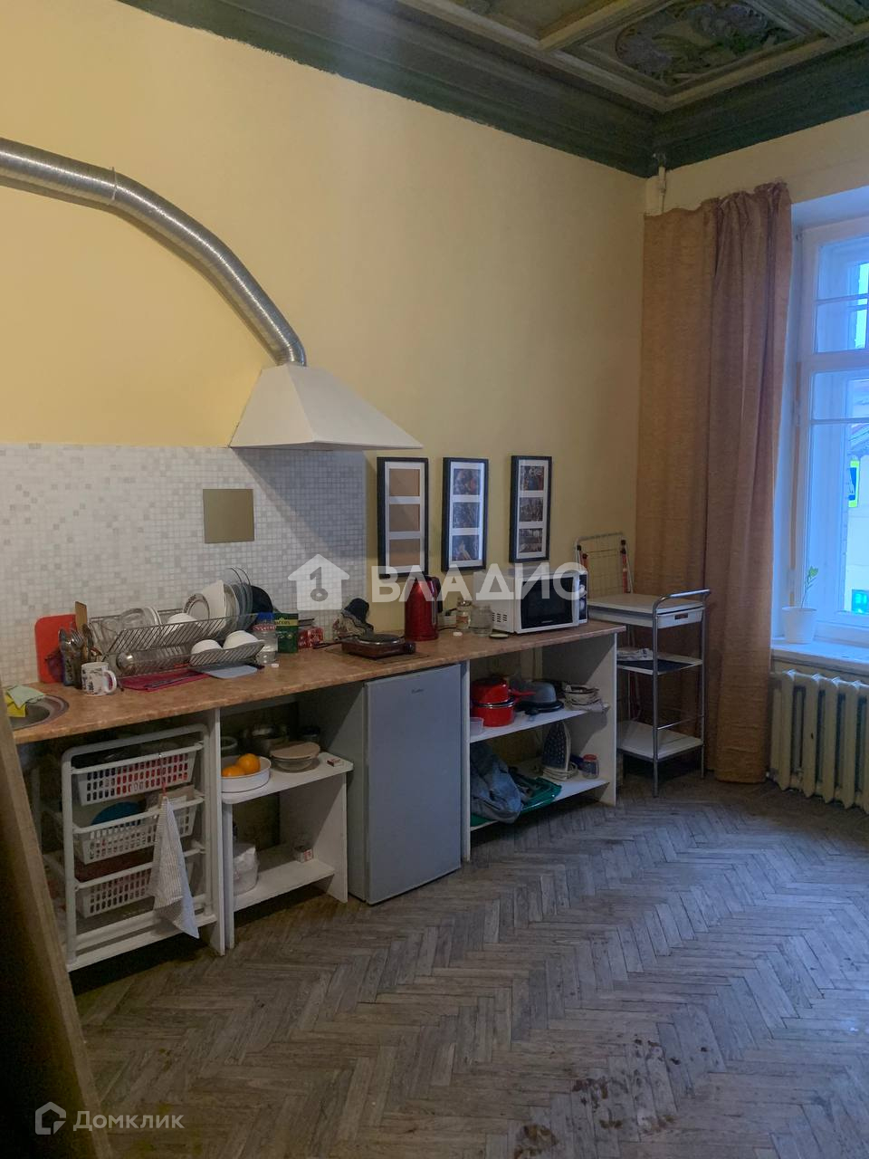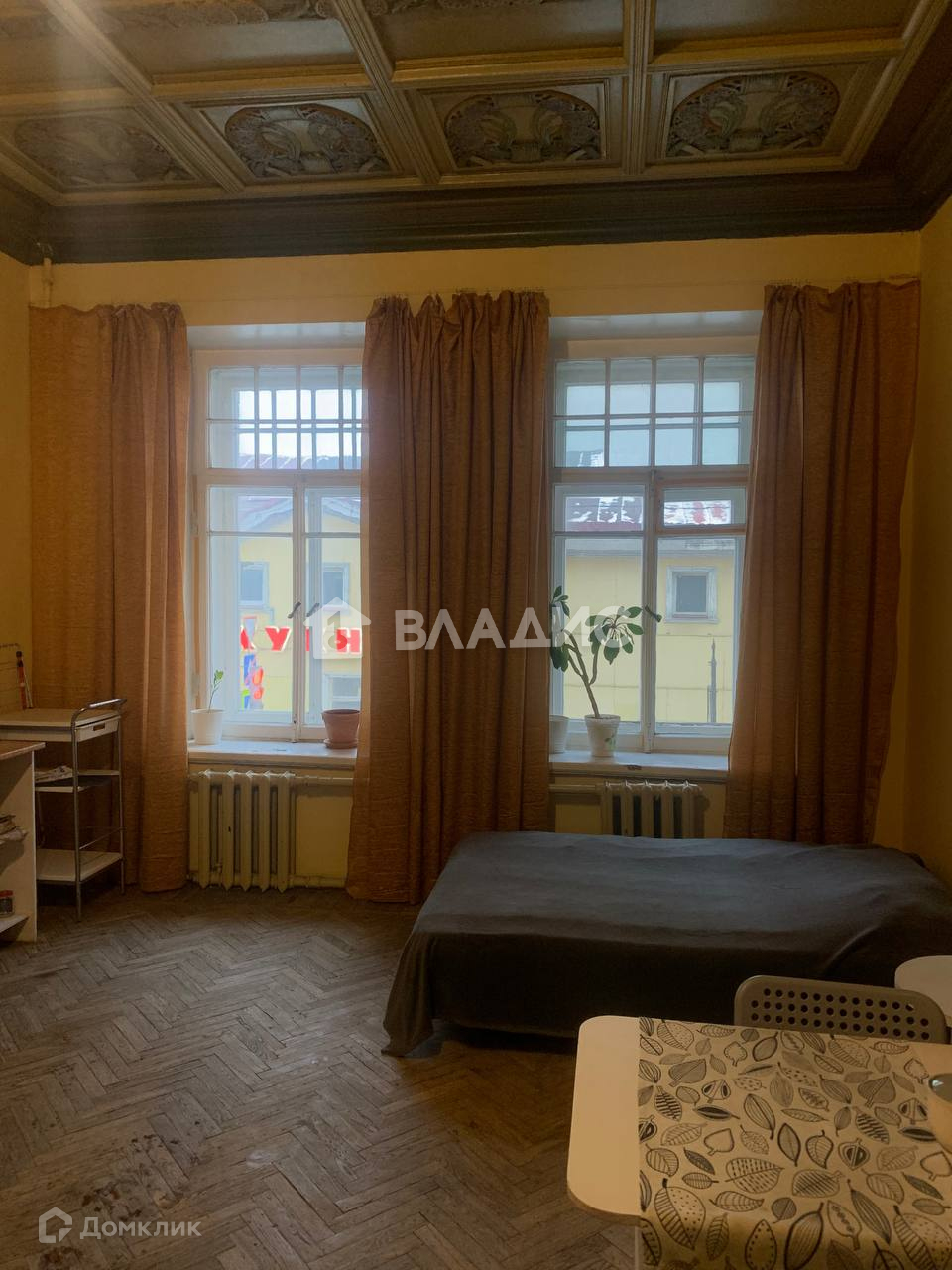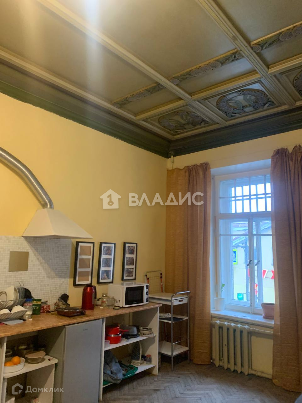 В студии есть собственный санузел, проведен газ, трехчастные окна с распашными створками, кессонные потолки 3,4 метра из дерева покрывают узоры, стены окрашены, пол выложен паркетной доской.